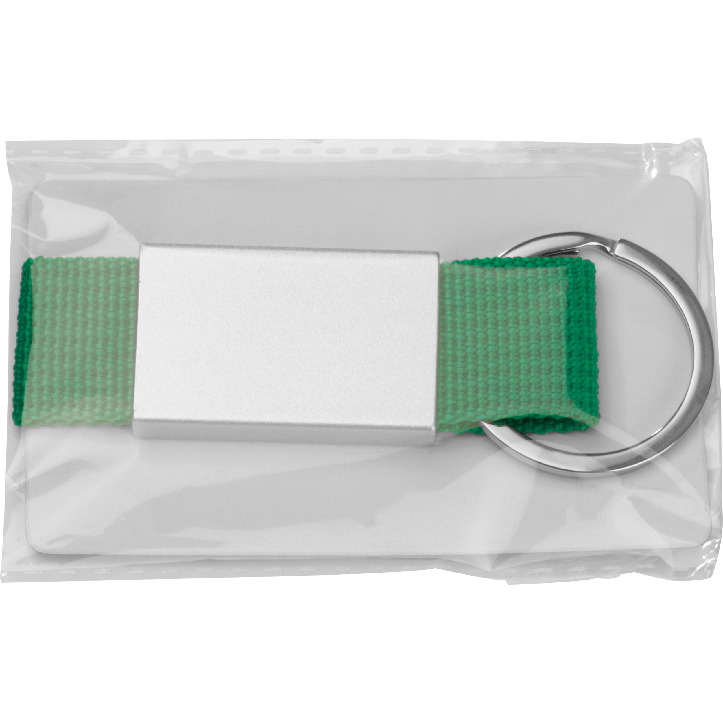 Schlüsselanhänger mit farbigem Stoffbändchen und glänzendem Metallplättchen, auf das Ihre Werbung mittels Lasergravur angebracht wird.