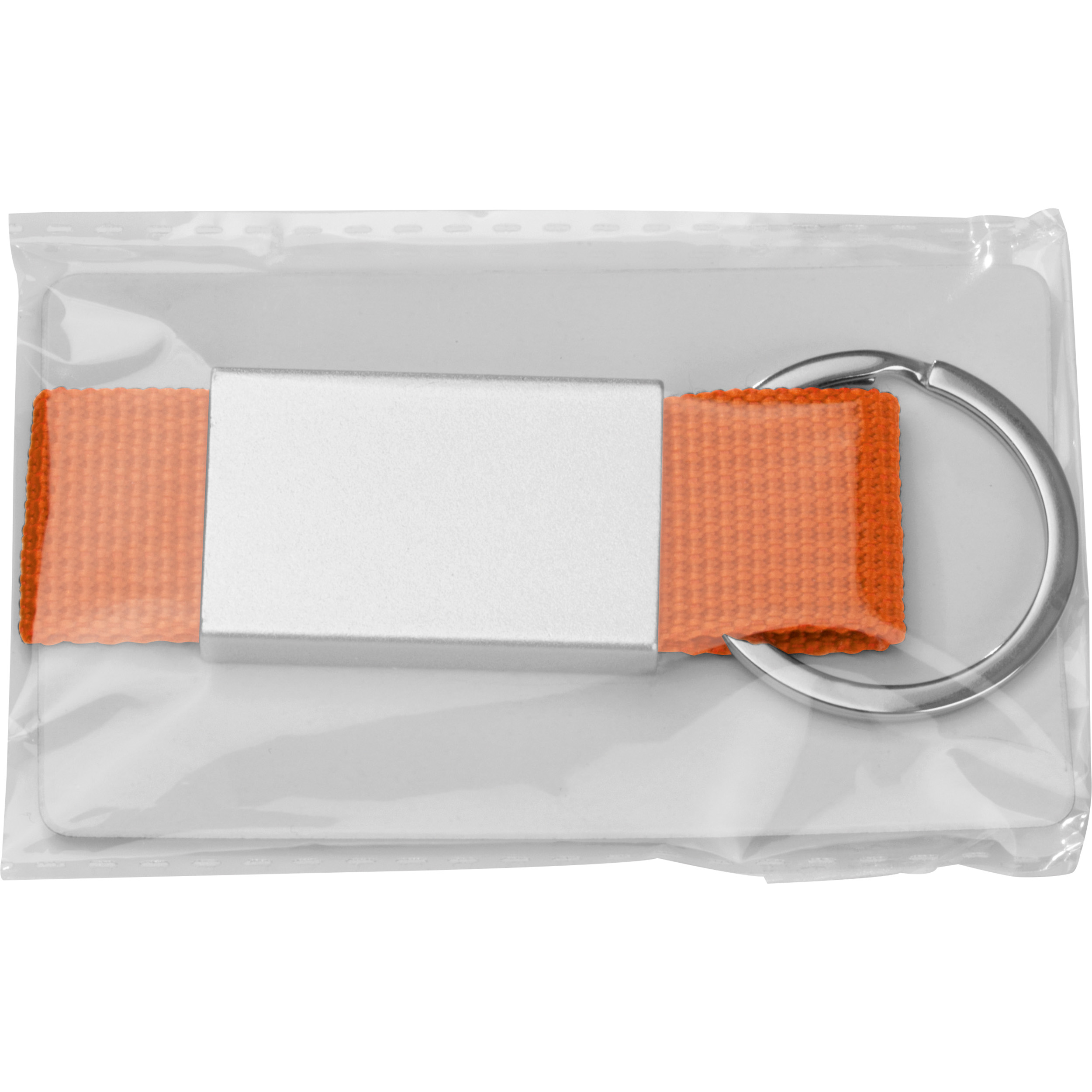 Schlüsselanhänger mit farbigem Stoffbändchen und glänzendem Metallplättchen, auf das Ihre Werbung mittels Lasergravur angebracht wird.