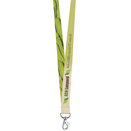 Schlüsselband / Lanyard RPET flachgewebtes Polyester mit Heißtransferdruck auf zwei Seiten mit Karabinerhaken
