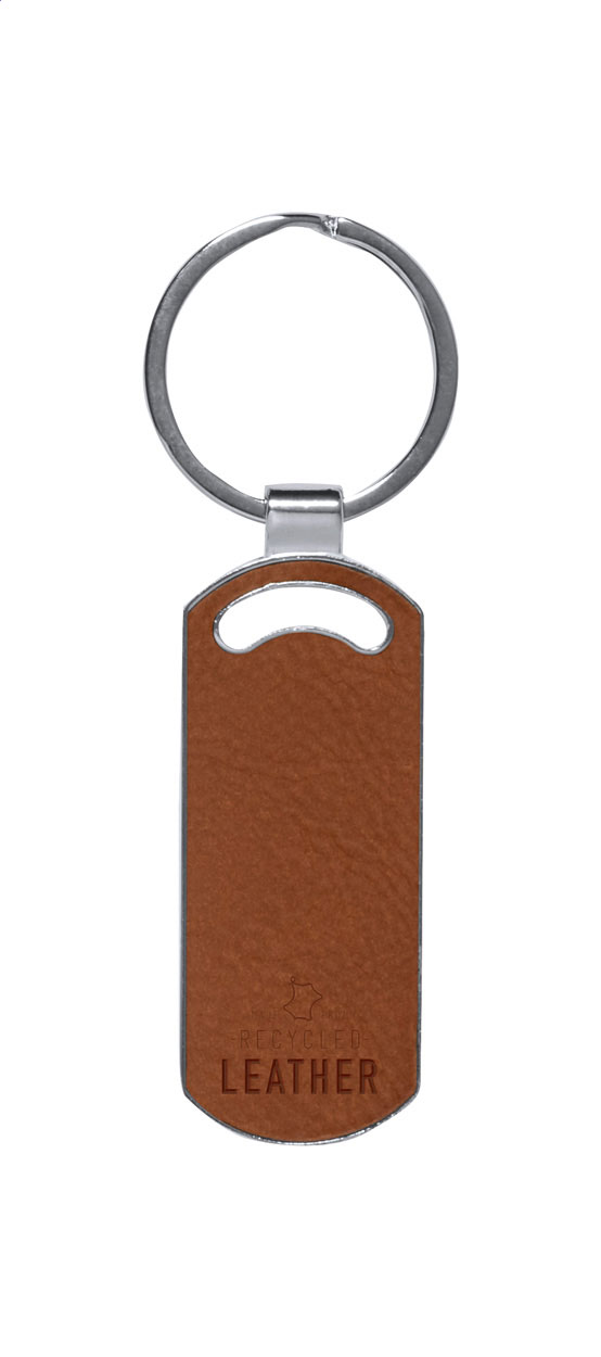 Schlüsselanhänger aus Metall mit recyceltem Leder überzogen.