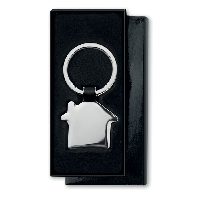Schlüsselanhänger in Form eines Hauses. Aus Metall. Hochglänzendes Nickel-Finish.