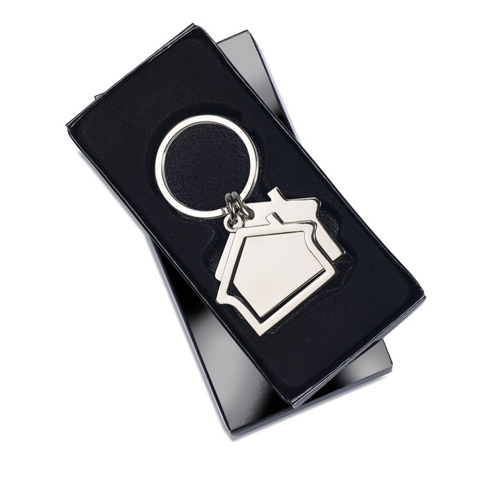 Schlüsselring aus Metall mit Anhängern in Form eines Hauses.