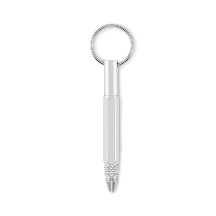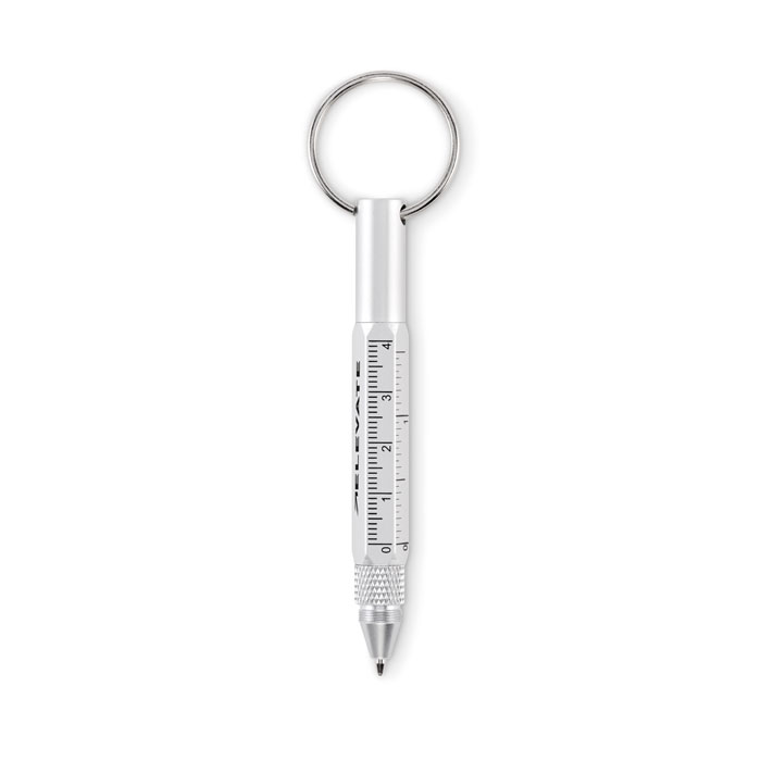 Schlüsselring mit Drehkugelschreiber aus recyceltem Aluminium, Stylus, Lineal 4 cm/1,5 Zoll und 2in1 Phillips- und Flachkopfschraubendreher. Schwarze Tinte.