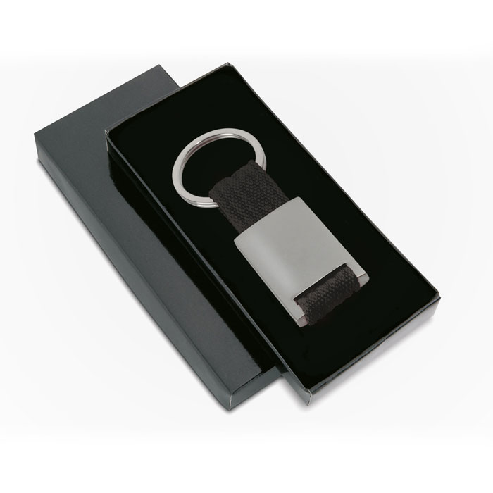 Schlüsselring aus Metall mit Zinklegierung und Textil-Anhänger.