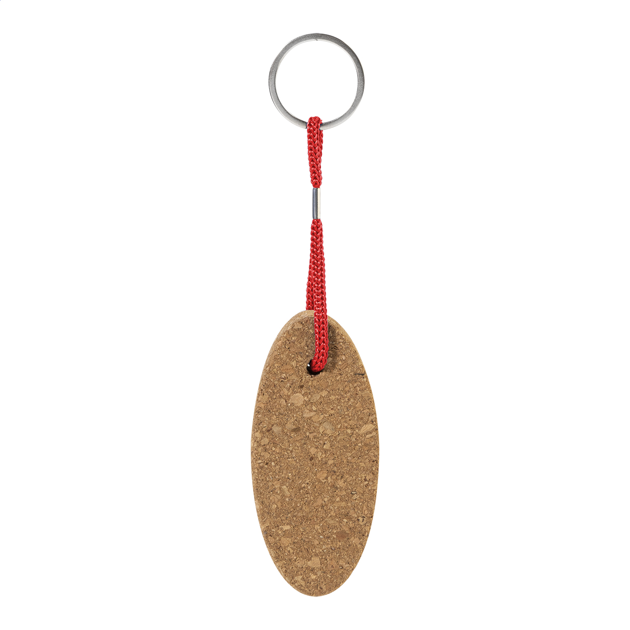Schwimmbarer Schlüsselanhänger aus natürlichem Kork mit Polyesterkordel und Metallring.