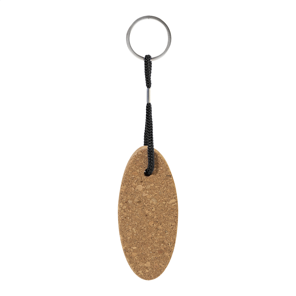 Schwimmbarer Schlüsselanhänger aus natürlichem Kork mit Polyesterkordel und Metallring.