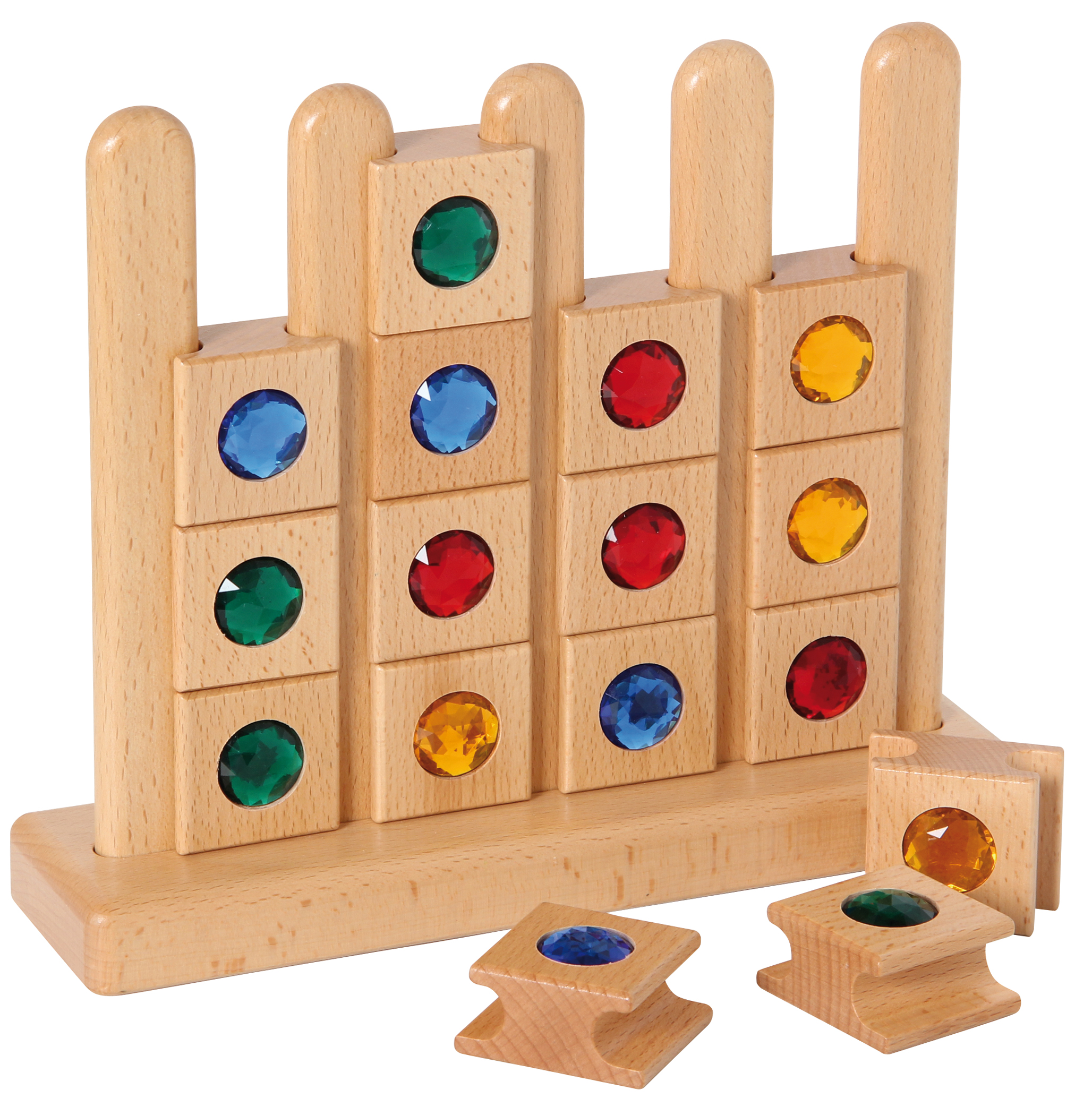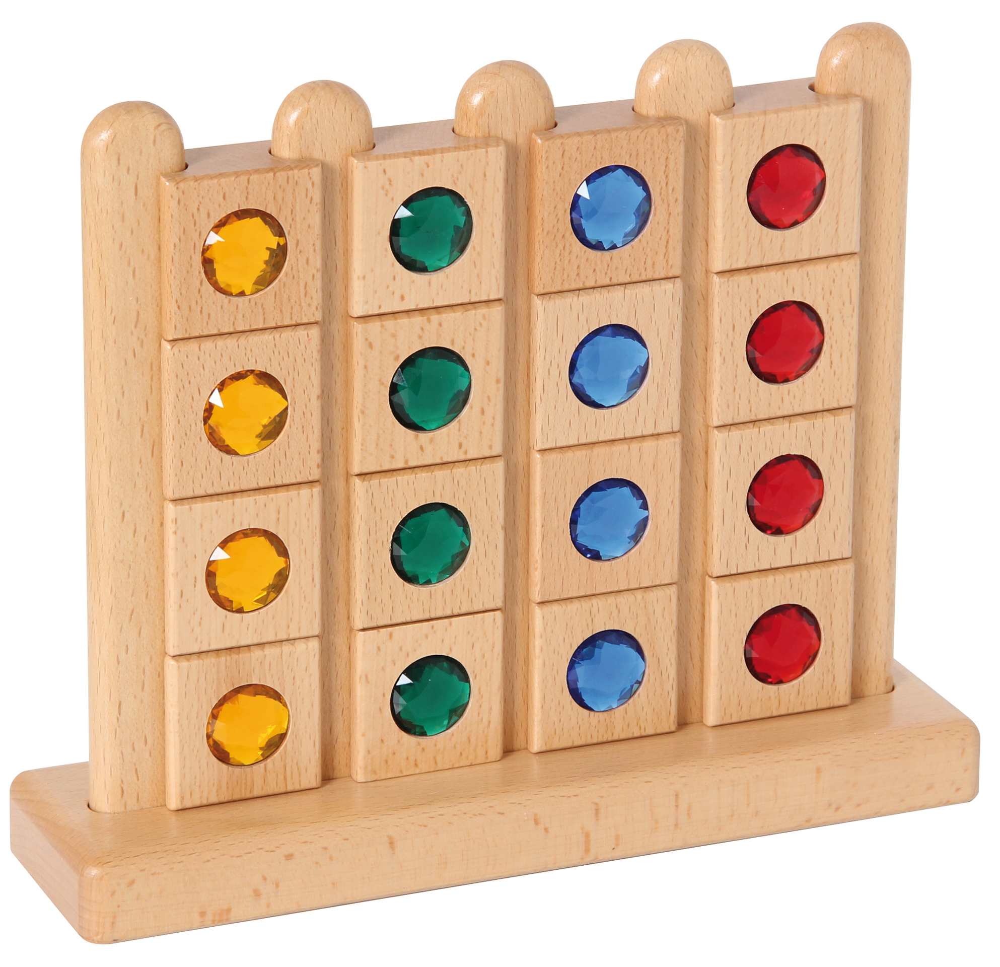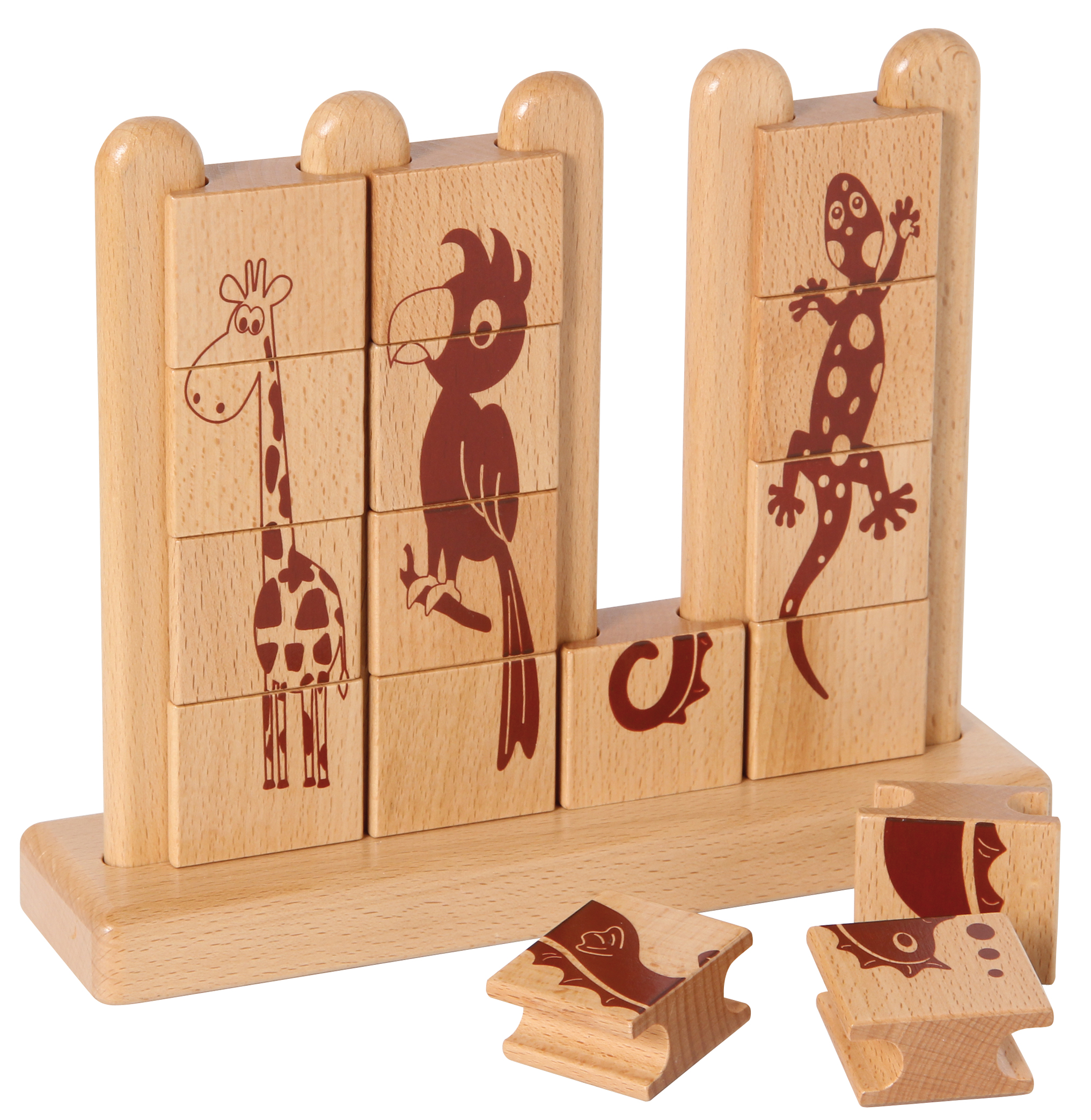 Hochwertiges, beidseitig bespielbares Steckspiel aus Buche mit verschiedenen Vorlagekarten. Auf der einen Seite heißt es, vier verschiedene Tiere richtig zusammenzusetzen. Die andere Seite präsentiert verschiedenfarbige Schmucksteine. Diese muss man so anordnen, wie es die Vorlagenkarten zeigen oder man kreiert eigene Muster. Dabei lernt man Farben, Mengen und Reihenfolgen kennen. Hochwertige Ausführung aus Buchenholz! In Kindergartenqualität!