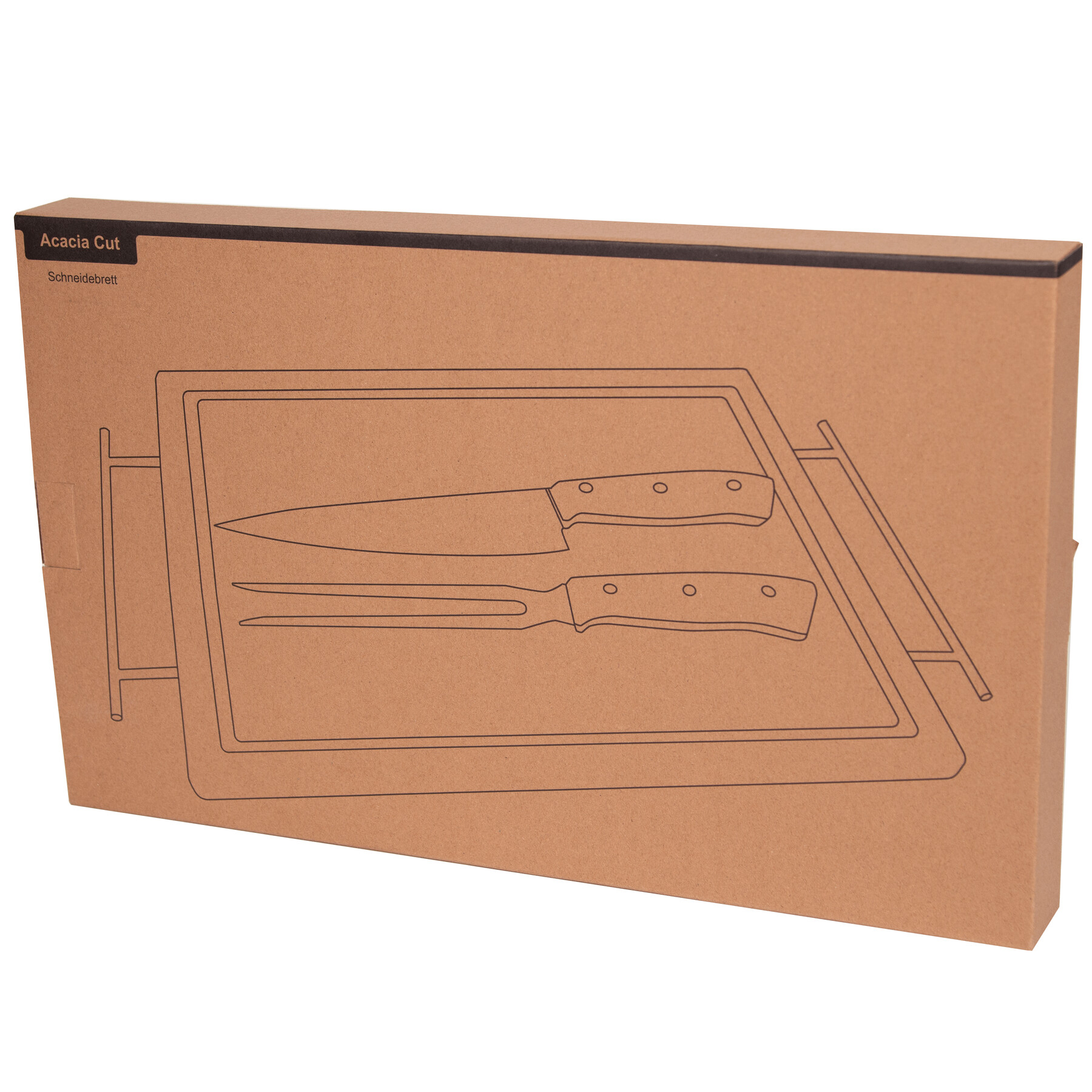 Schneidebrett ACACIA CUT: inkl. Tranchierbesteck, Messer und Gabel aus Edelstahl mit Akazienholzgriffen, mit praktischer Ablaufrille am Rand und Metallgriffen, in Box
