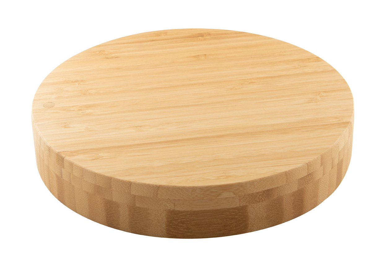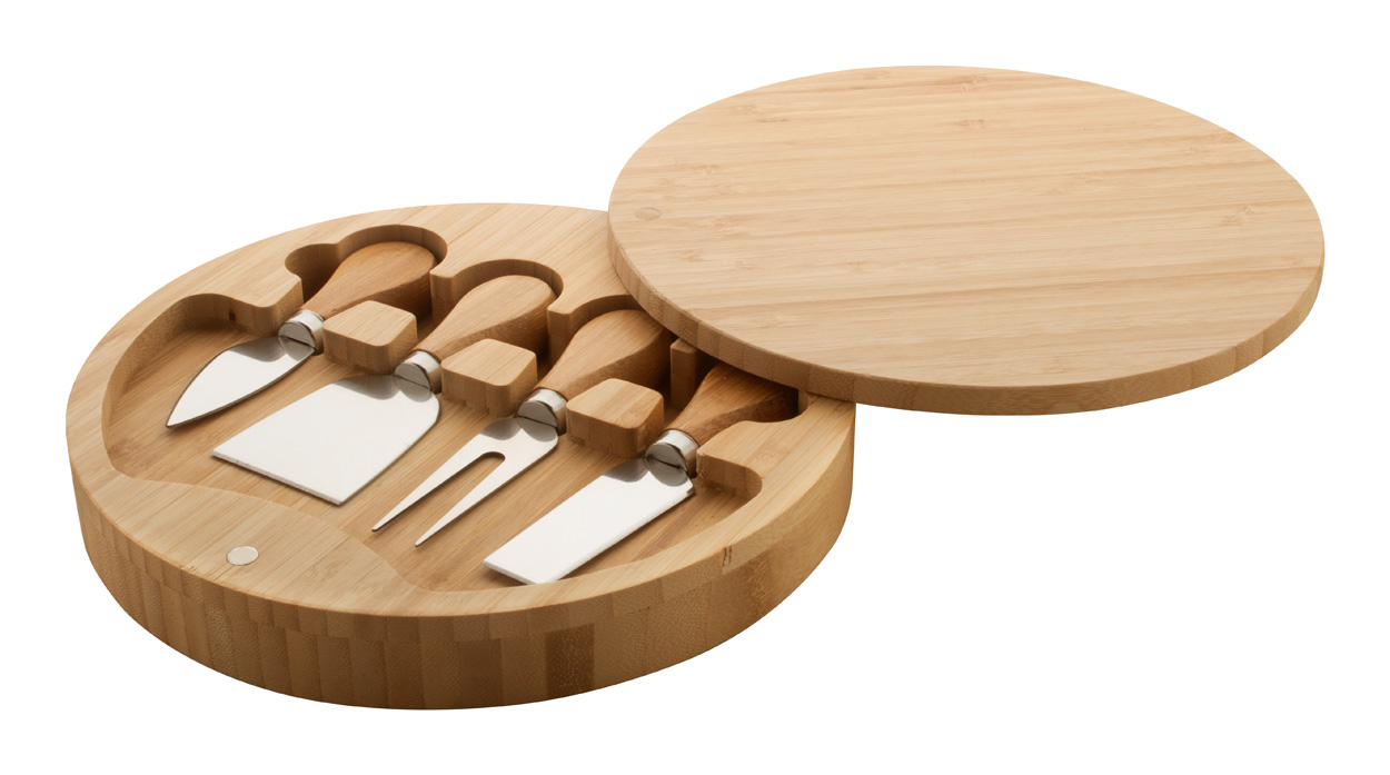 Rundes Schneidebrett aus Bambus mit 4-teiligem Käsemesser-Set aus Edelstahl.