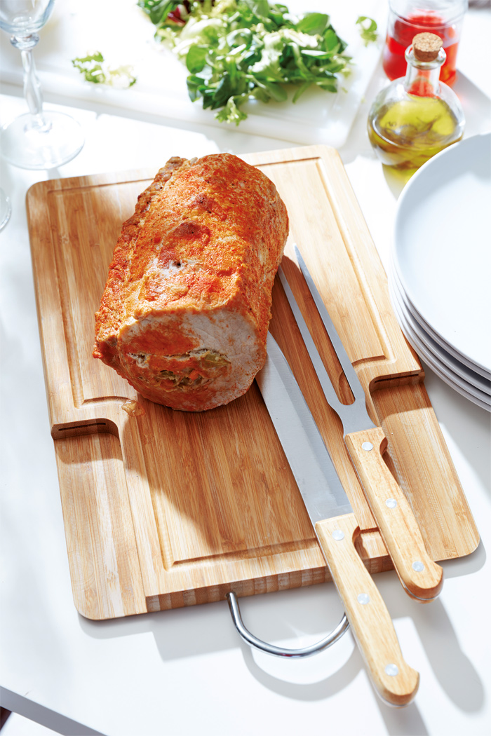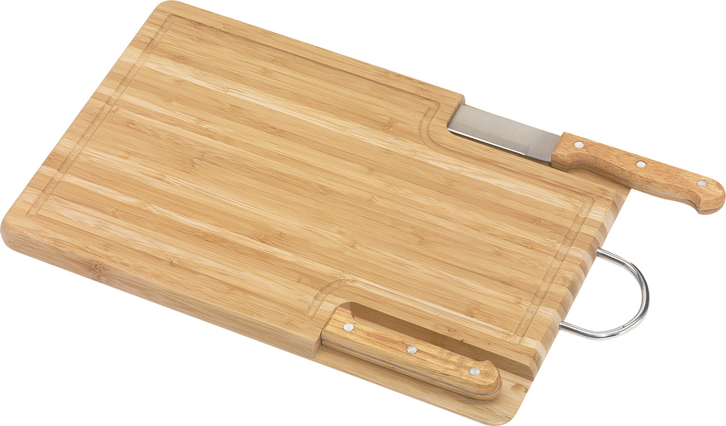 Schneidebrett BAMBOO-CUT: aus Bambus, inkl. Tranchierbesteck, Messer und Gabel aus Edelstahl mit Holzgriff, im Brett integrierte Schlitze zur sicheren Aufbewahrung des Bratenbestecks, mit praktischer Ablaufrille am Rand und Metallgriff zum Aufhängen, in Box