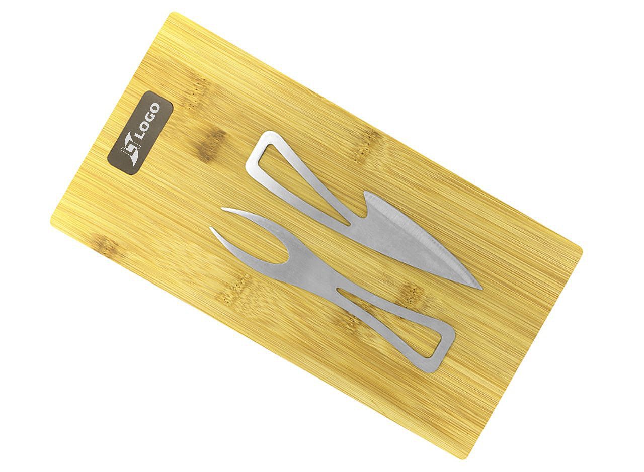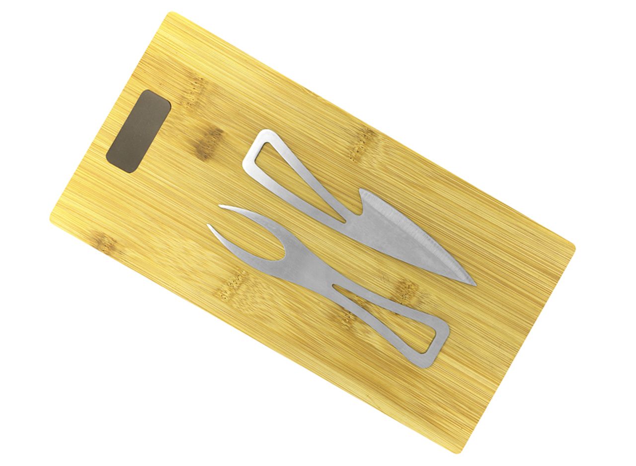 Bambus. Metallplättchen mit Titan-Finish. Inklusive Käsemesser und Käsegabel (jeweils 16 cm) aus 420er Edelstahl in Lebensmittelqualität mit satinierter Oberfläche. Aufbewahrung des Bestecksets in Inneren des Bretts. Die Vorteile in Kürze: - Bambus ist aufgrund seiner wasserfesten und antibakteriellen Eigenschaften eines der am häufigsten verwendeten Hölzer für Schneidebretter. - Erhebliche Dicke, um die Form im Laufe der Zeit beizubehalten und gleichzeitig das "Arbeiten" des Holzes zu vermeiden. - Einfache Aufbewahrung des Bestecksets im Inneren des Bretts. Anmerkung: Um das Herausnehmen zu erleichtern, sind die Klingen nicht bis zum Anschlag einsteckbar. - Elegantes Besteckset mit stilistischen Design. Das Brett kann auch als Präsentationsbrett genutzt werden kann.