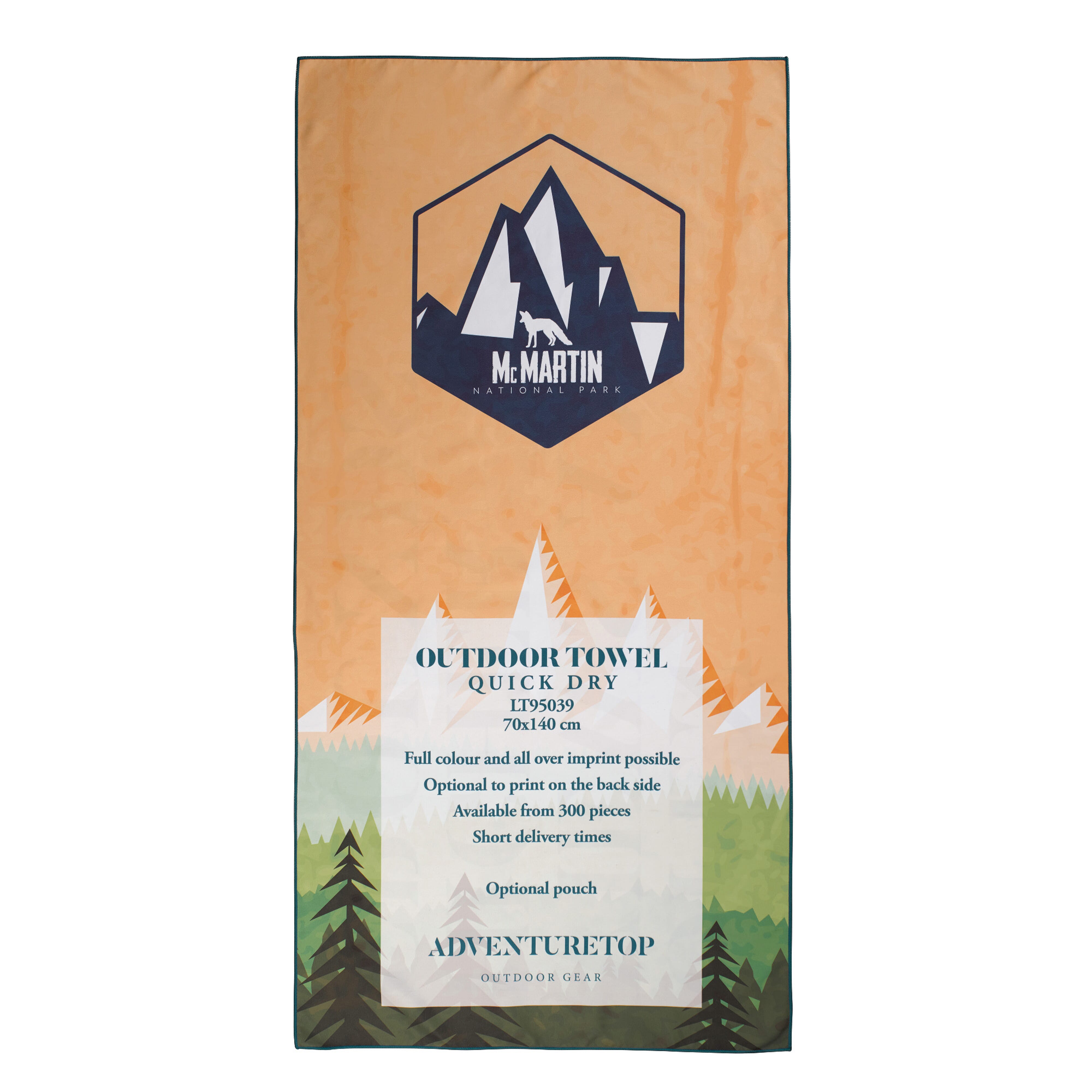 Komfortables Outdoor-Handtuch aus schnell trocknender Mikrofaser (200g / m²). Es enthält einen individuellen, vollfarbigen Druck auf einer Seite und einen optionalen vollfarbigen Druck auf der Rückseite. Zusätzlich kann die Farbe der Naht angepasst werden.