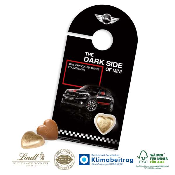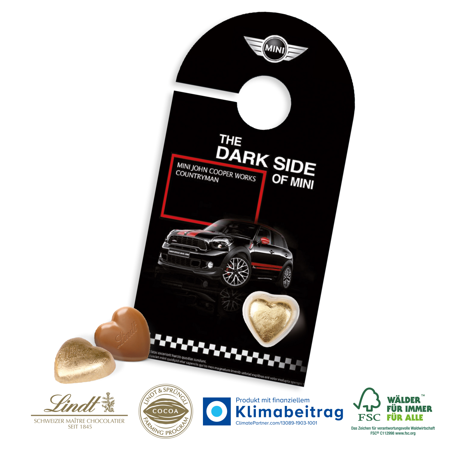 Kreativ, individuell und vielseitig! Ihre individuelle Werbebotschaft, kombiniert mit einem zartschmelzenden Lindt Schokoherz. Eine süßer Gruß mit Genussmoment! Sie wählen die Form: Ob rund, rechteckig, in Herzform oder als Anhänger, damit wird Ihre Werbeaktion zum Volltreffer.
