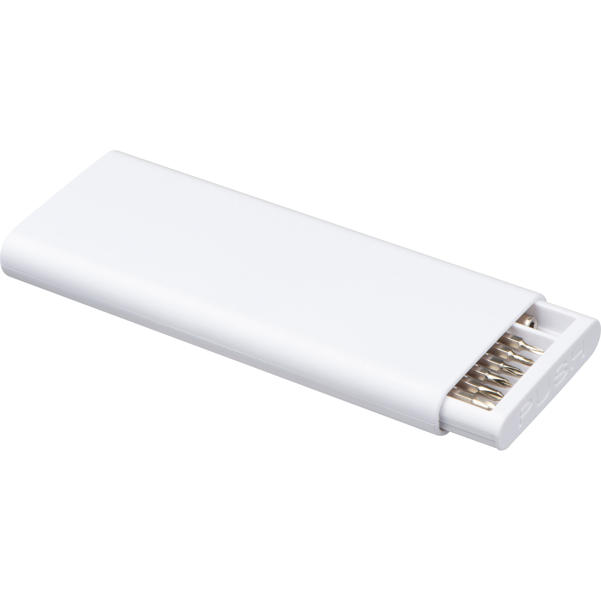 Schraubendreherset mit 24 magnetischen Präzisions-Schlitz- und Kreuzbits aus Edelstahl und Halterung in einer Kunststoffverpackung zum Aufschieben. Ihre Werbung wird auf die Verpackung gedruckt.