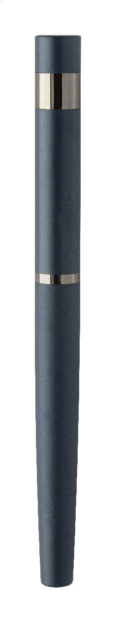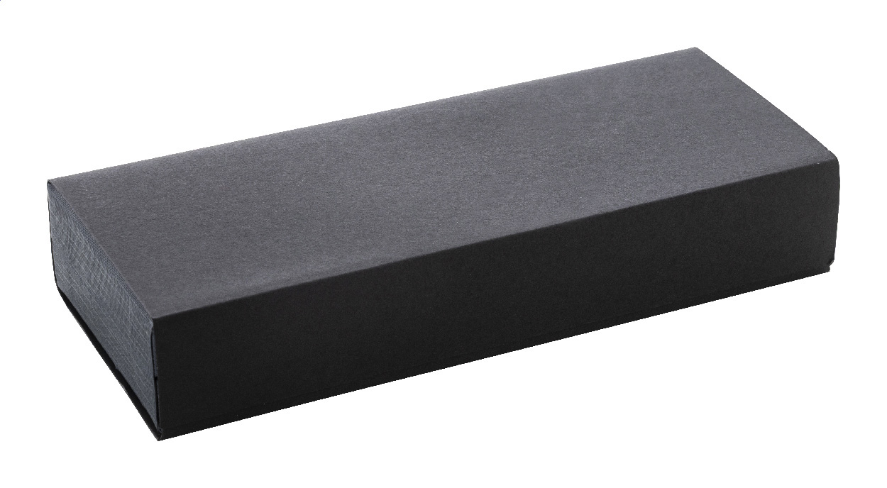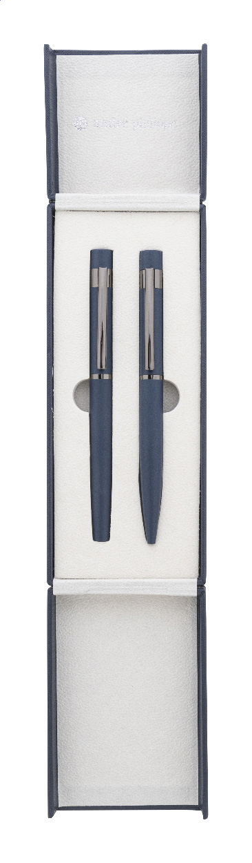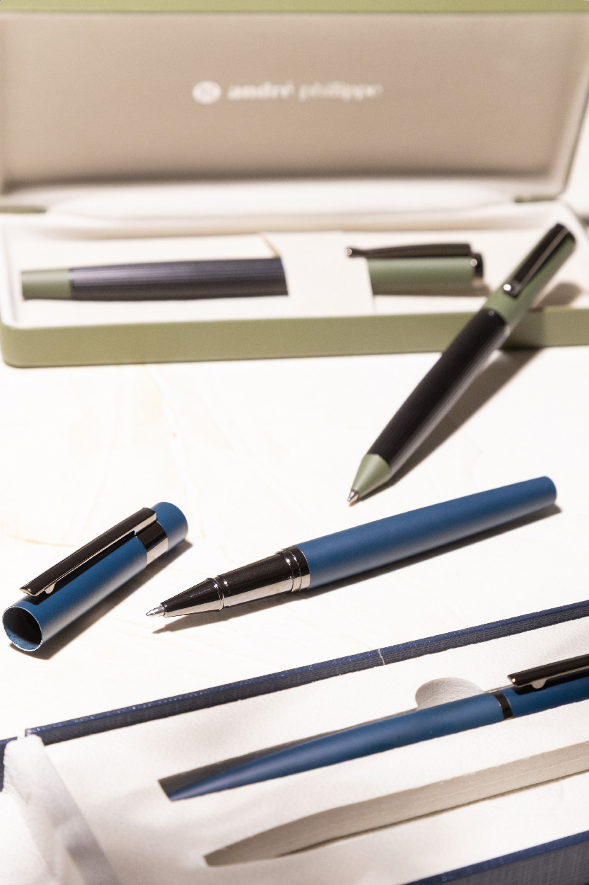 Elegantes Kugelschreiber- und Tintenroller-Set aus Metall mit glänzenden Gunmetal-Details, blauschreibend. In farblich abgestimmter Geschenkbox. Marke: André Philippe.