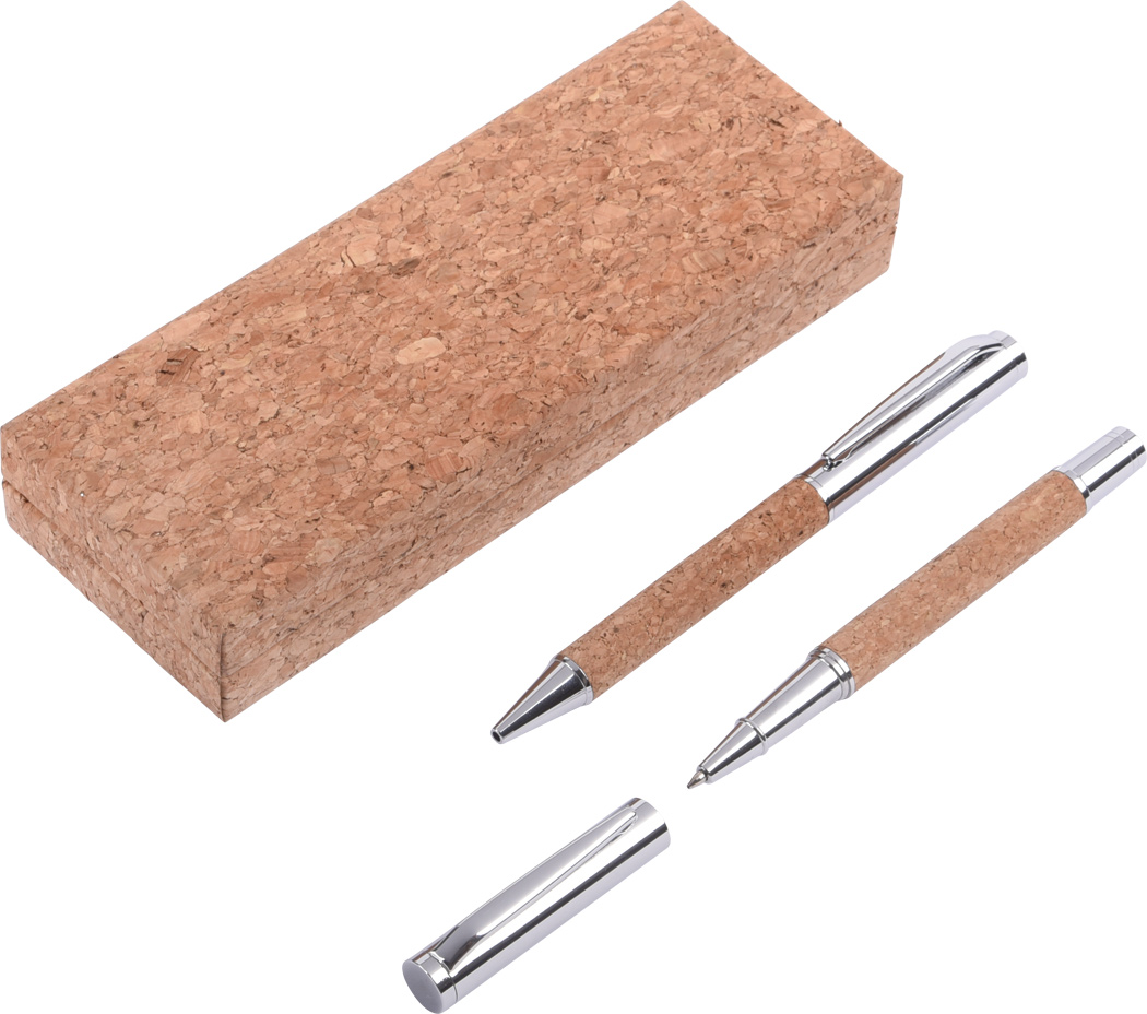 Schreibset CORK SIGNATURE, 2-teilig: bestehend aus Kugelschreiber mit Drehmechanismus (blauschreibend) sowie Tintenroller mit Verschlusskappe mit Clip (schwarzschreibend), beide Schreibgeräte mit Metall-Schaft und Griffzone aus Kork, im Kork-Etui