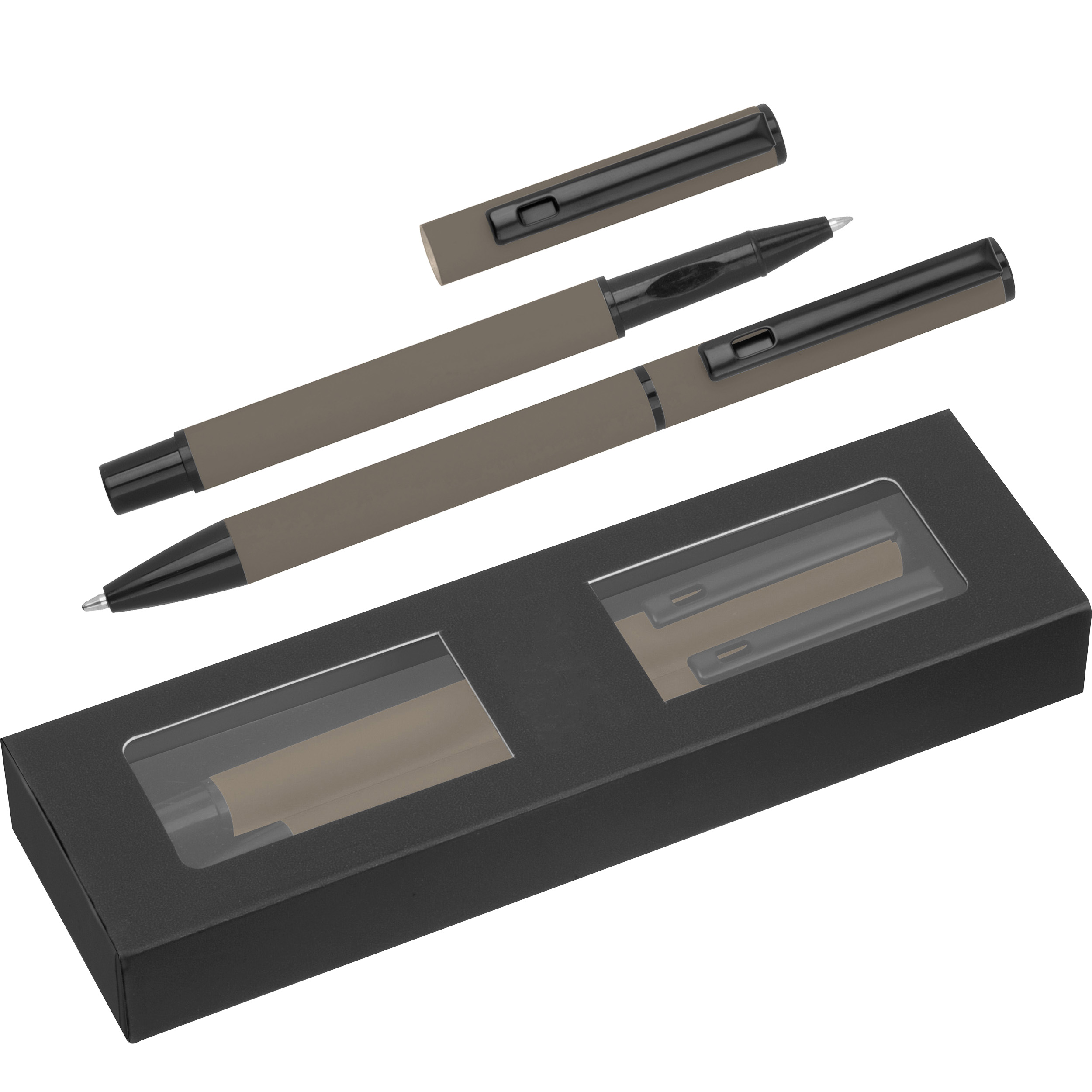 Schreibset aus Aluminium bestehend aus einem schwarzschreibenden Rollerball und einem blauschreibenden Drehkugelschreiber (Kunststoffgroßraummine) und einer Box. Ihre Werbung bringen wir mittels einer Lasergravur auf beiden Stiften in gleicher Größe an.