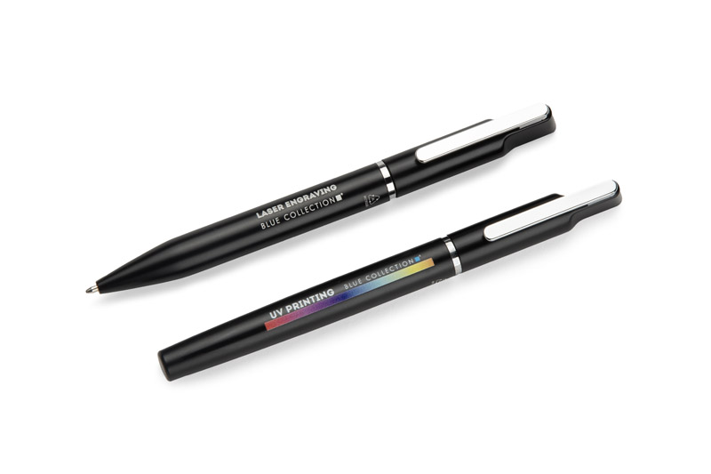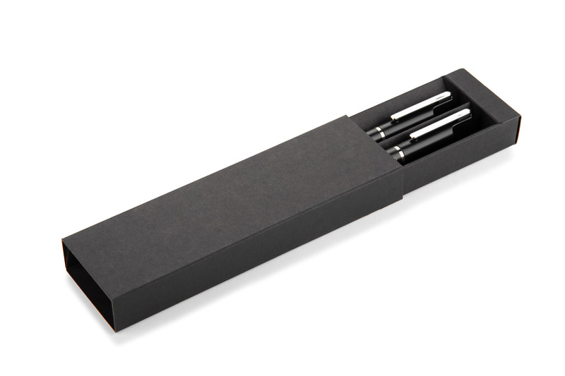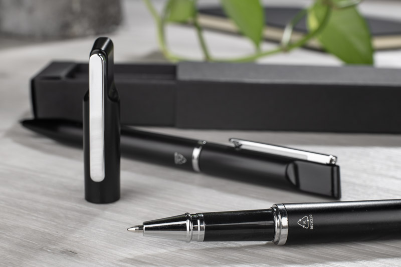 Das EFAN Schreibset ist ein stilvolles Set bestehend aus einem Stift und einem Kugelschreiber aus recyceltem Aluminium. Beide Teile haben ein schlankes schwarzes Design mit matter Oberfläche und dezenten silbernen Details. Der Kugelschreiber wird mit einer blauen Feder und der Kugelschreiber mit einer schwarzen Feder geliefert, beide mit einer Schreibstärke von 1,0 mm und einer Länge von bis zu 500 Metern. Alles verpackt in einer schwarzen Kraftpapierbox.
