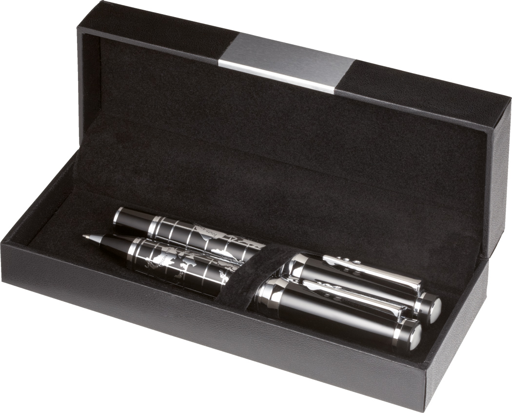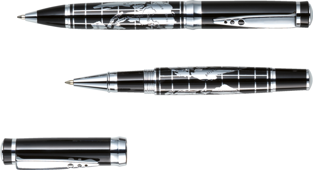 Schreibset INTERCONTINENTAL: bestehend aus Metall-Tintenroller mit Verschlusskappe (schwarzschreibend) und Metall-Drehkugelschreiber (blauschreibend), mit chromglänzendem Weltkarten-Design auf dem Schaft, Lieferung in edler Geschenkbox mit Aluminiumplatte für Veredelung