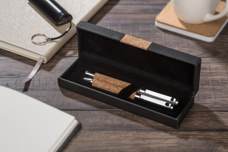 KANSAS ist ein elegantes Schreibset für Liebhaber natürlicher, umweltfreundlicher Materialien. Das Set besteht aus einem Kugelschreiber und einem Tintenroller aus Metall und Korken. Geschmackvolles schwarzes Etui, verziert mit einem Korkenelement. Kugelschreiber mit Drehmechanismus "Twist", mit schwarzer Mine, Kugelschreiber mit Stecker, mit Mine in schwarz.