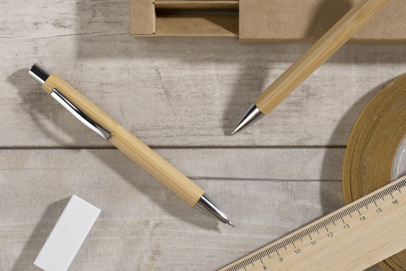 Das Schreibset MAMBOO besteht aus einem Kugelschreiber und einem automatischen Bleistift, die in einem braunen, umweltfreundlichen Karton verpackt sind. Der Körper von Kugelschreiber und Bleistift besteht aus natürlichem Bambus. Chromelemente verleihen ihm Eleganz. Blaue Kugelschreibermine, Druckbleistift 0,7 mm dick.