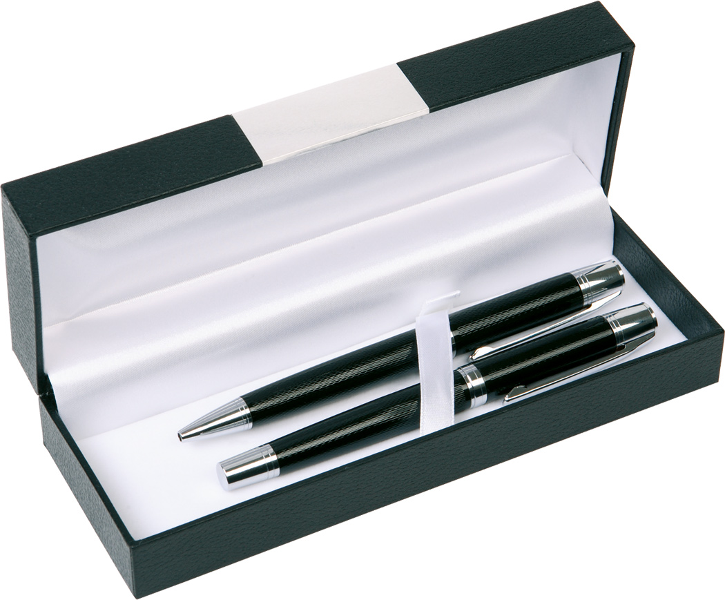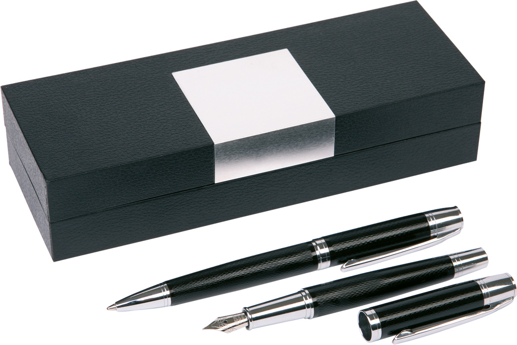 Schreibset MANZONI, 2-teilig: bestehend aus Kugelschreiber mit Drehmechanismus (schwarzschreibend) sowie Füllfederhalter mit Verschlusskappe mit Clip, inkl. 1 Tintenpatrone, beide Schreibgeräte mit Metall-Schaft, im Etui mit Aluminiumplatte