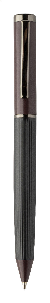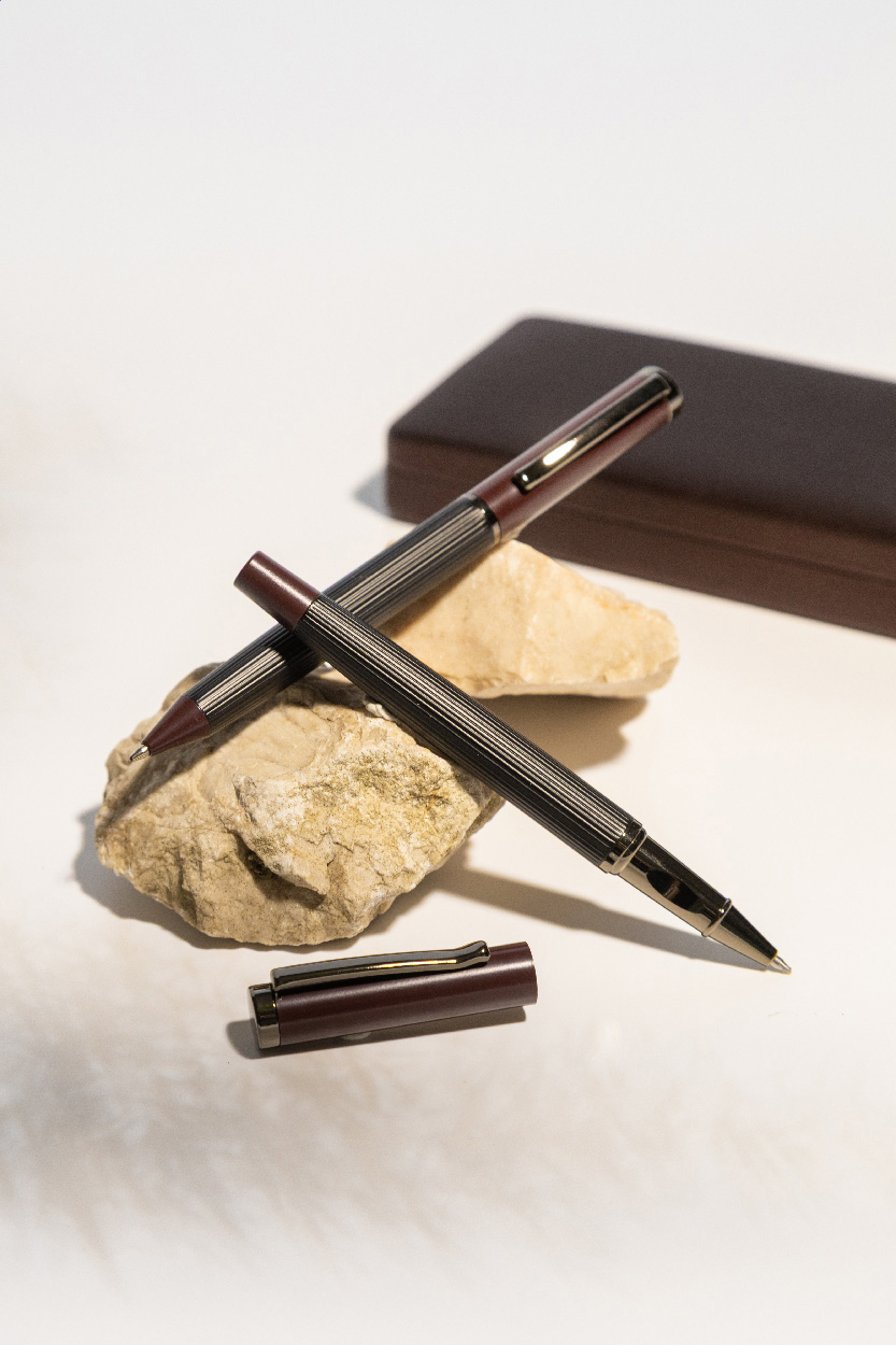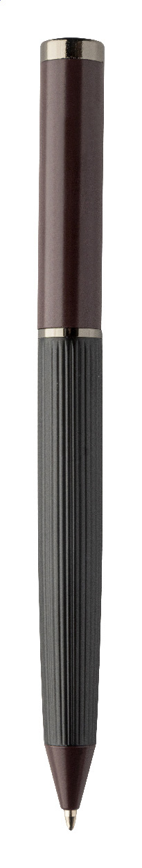 Elegantes Kugelschreiber- und Tintenroller-Set aus Metall mit gestreiftem Schaft, farbigen Akzenten und glänzenden Gunmetal-Details, blauschreibend. In farblich abgestimmter Geschenkbox. Marke: André Philippe.