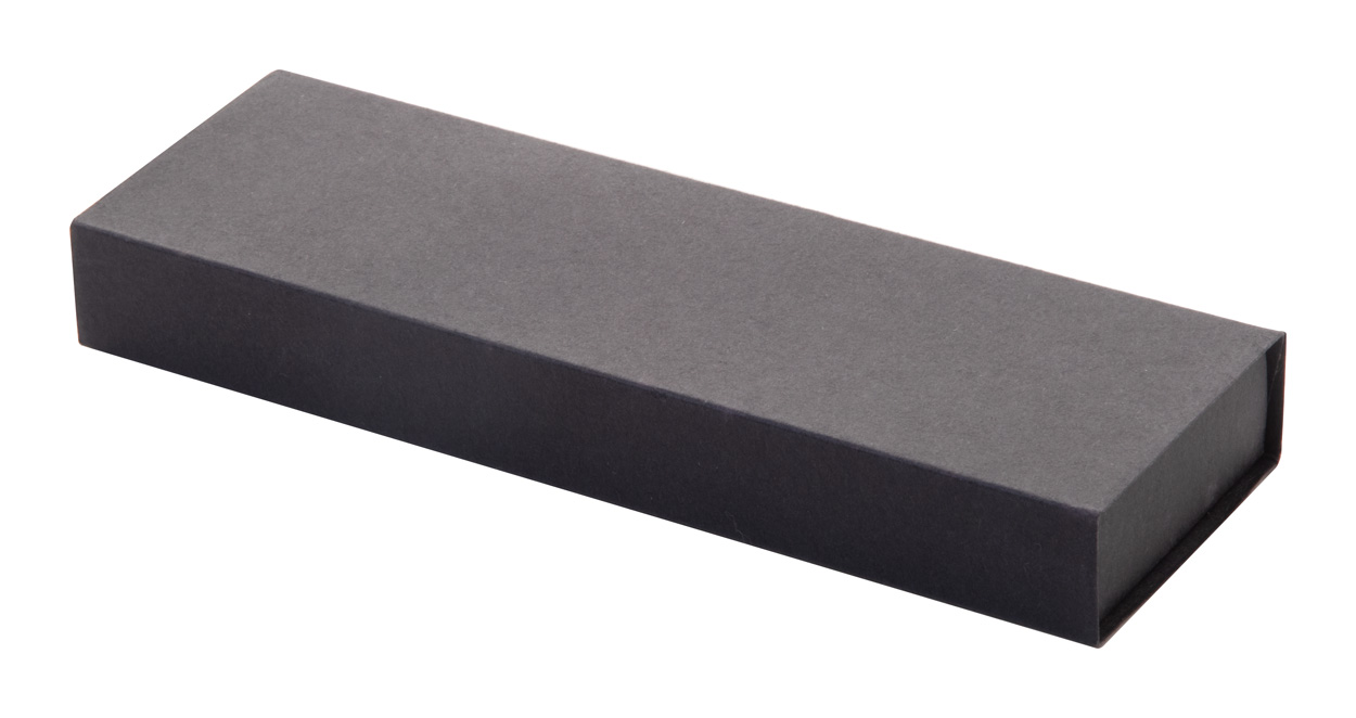 Stiftset aus recyceltem Aluminium mit Rollerball und Kugelschreiber in schwarzer Geschenkbox aus Papier, blauschreibend.