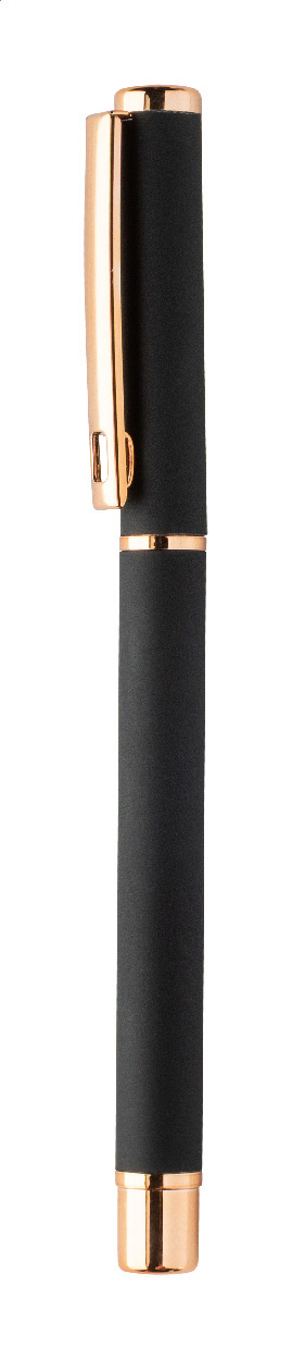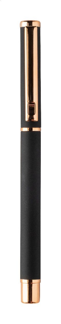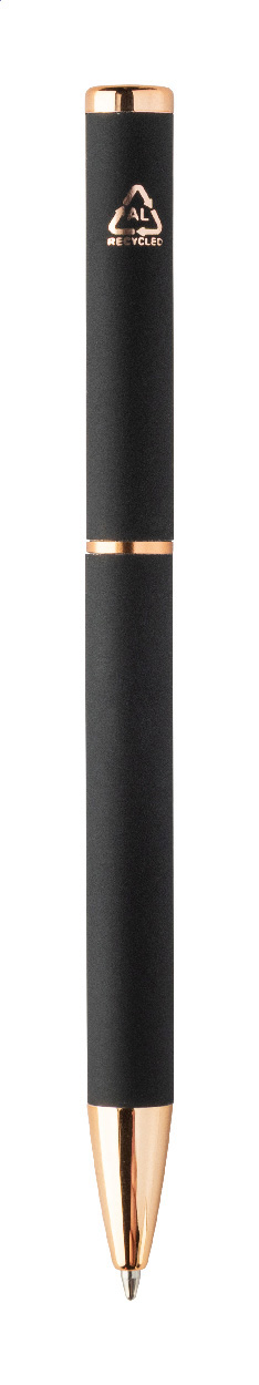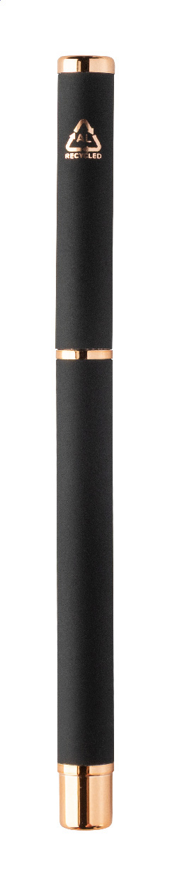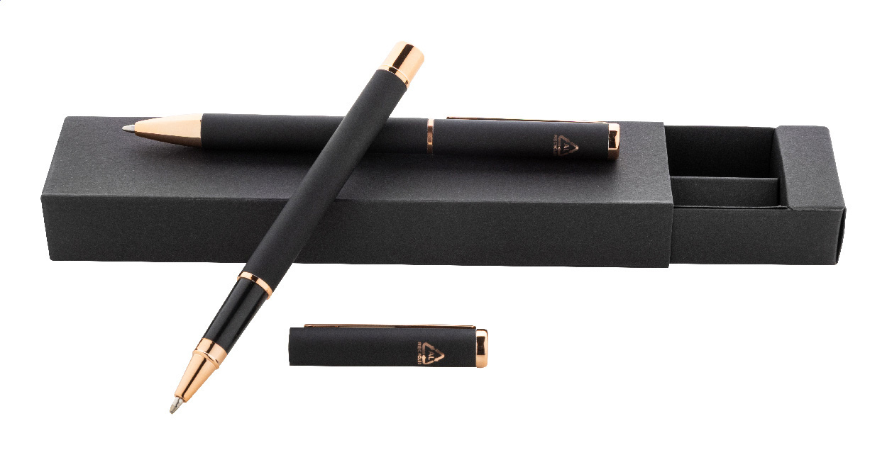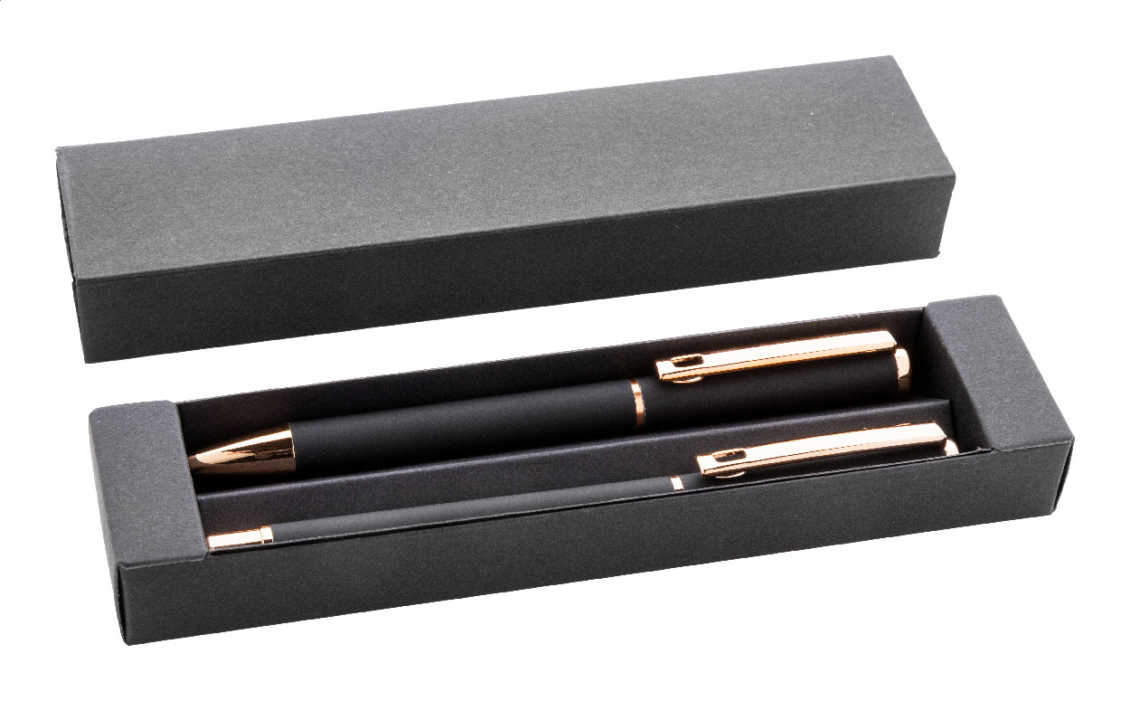 Kugelschreiber- und Tintenrollerset aus recyceltem Aluminium mit gummierter Oberfläche und roségoldenen Details, blauschreibend. Mit Spezialbeschichtung für Spiegelgravur in Roségold. Einzeln in schwarzer Geschenkbox aus Papier.