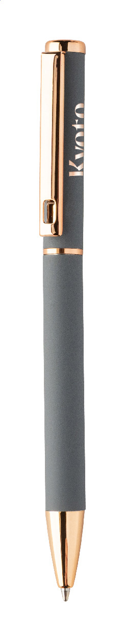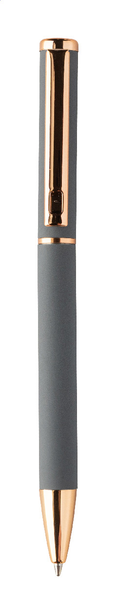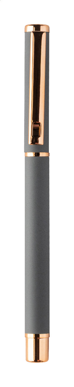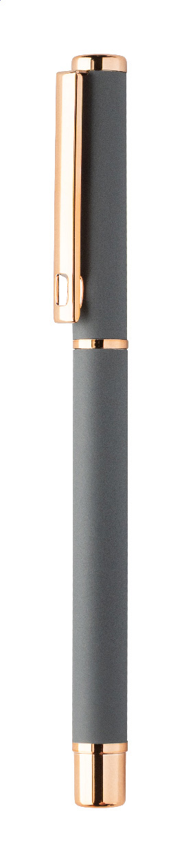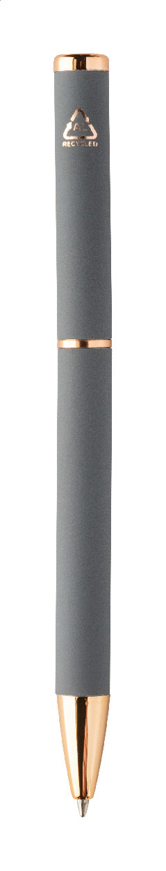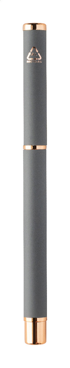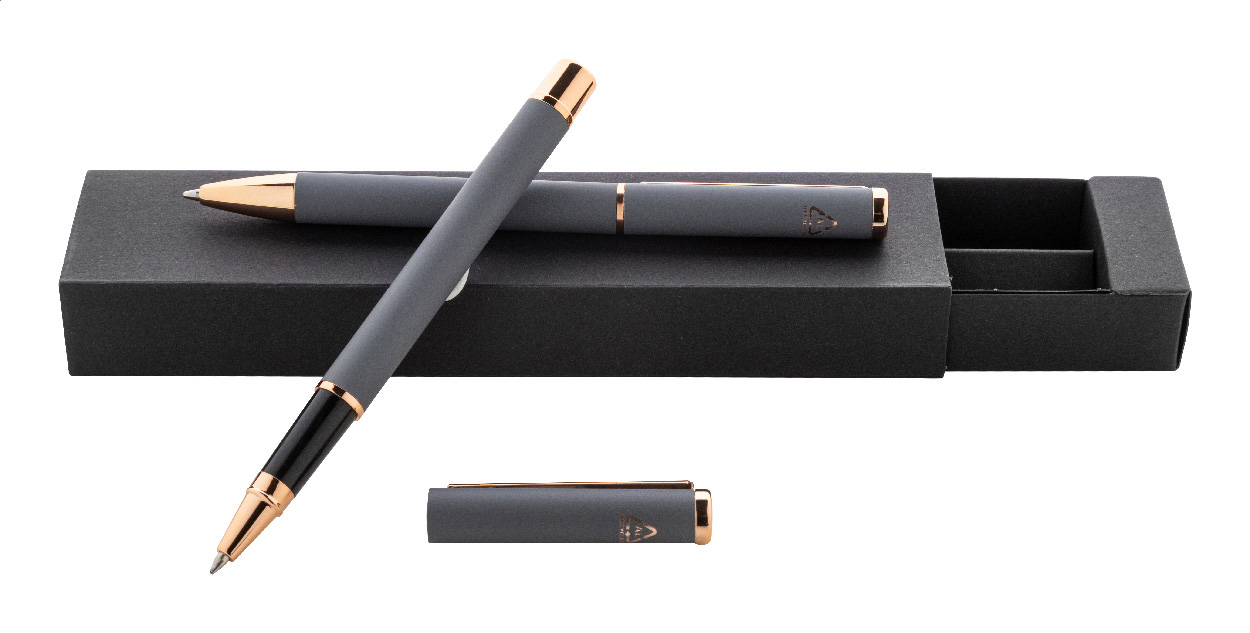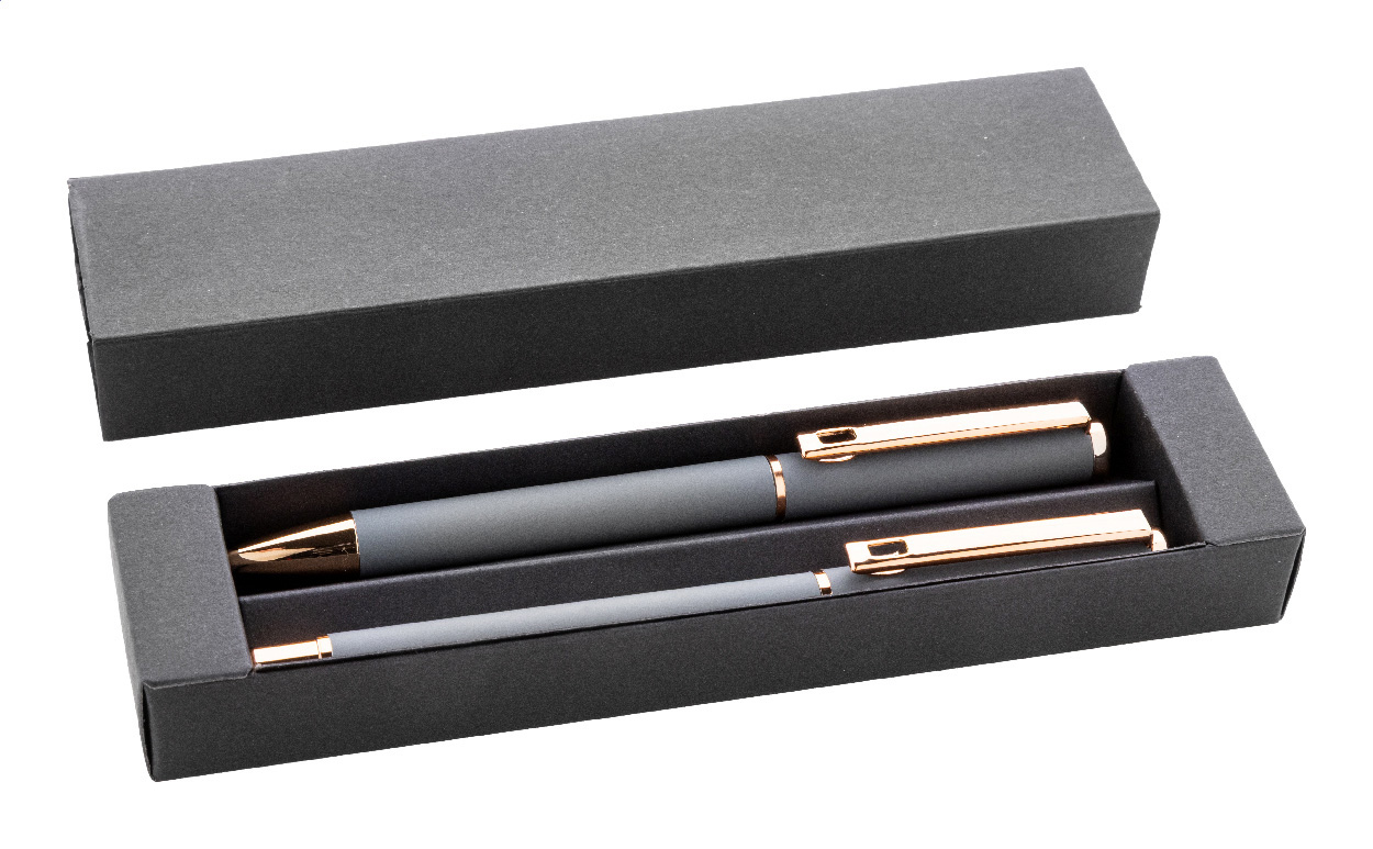 Kugelschreiber- und Tintenrollerset aus recyceltem Aluminium mit gummierter Oberfläche und roségoldenen Details, blauschreibend. Mit Spezialbeschichtung für Spiegelgravur in Roségold. Einzeln in schwarzer Geschenkbox aus Papier.
