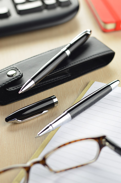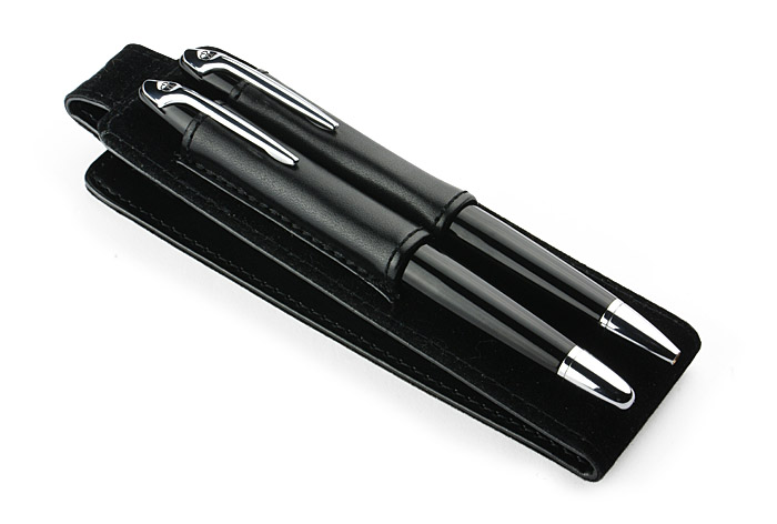 Elegantes Schreibset bestehend aus einem Kugelschreiber und einem Rollerball. Es ist in einem Etui aus lederähnlichem Material (PU) verpackt. Wir können Ihr Logo auf die Schreibgeräte gravieren.
