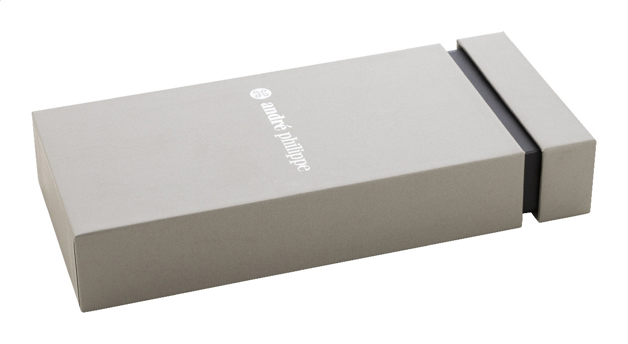 Elegantes Kugelschreiber- und Tintenroller-Set aus Metall mit diagonal strukturiertem Schaft, blauschreibend. In zweifarbiger Geschenkbox. Marke: André Philippe.