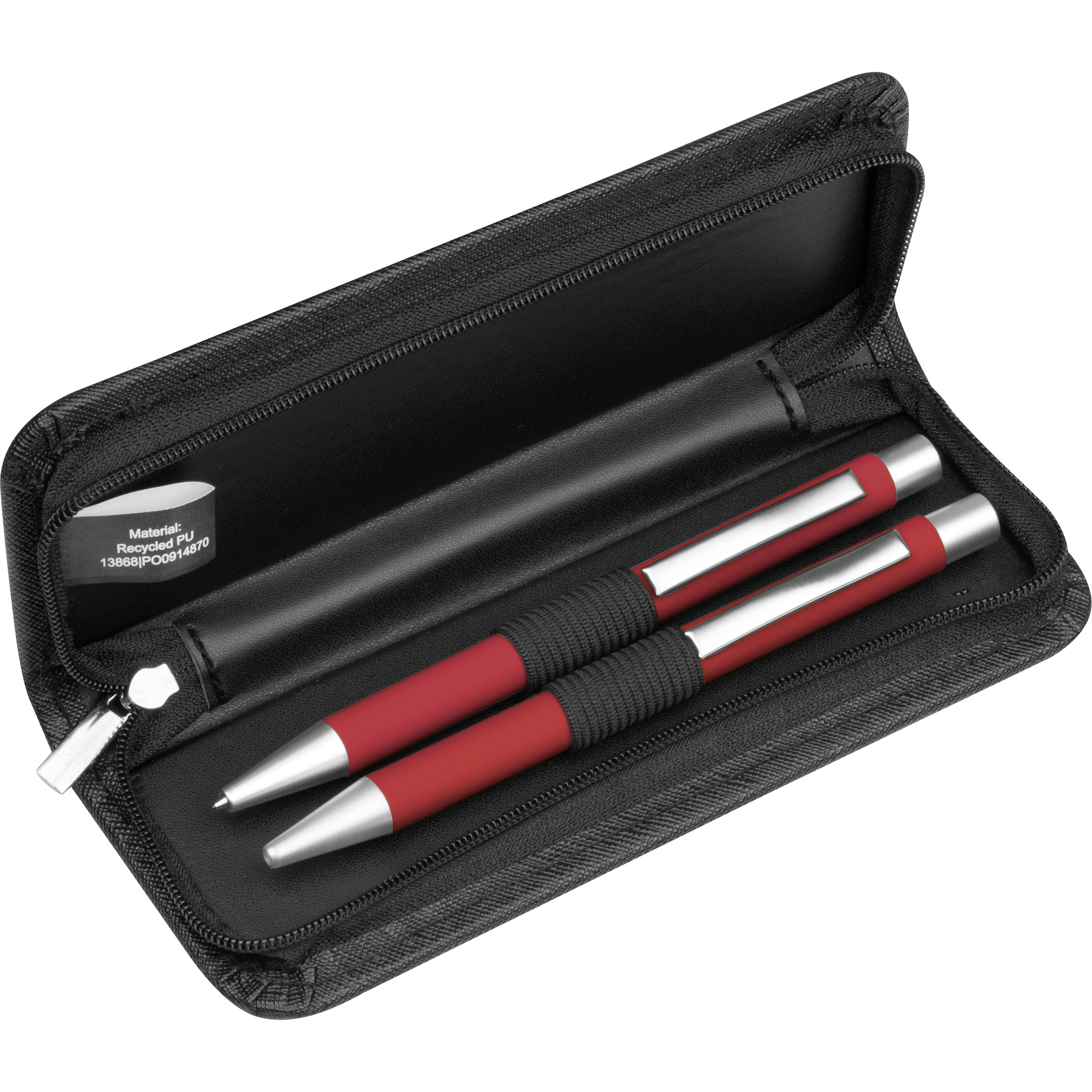Schreibset bestehend aus einem blauschreibenden Aluminium Kugelschreiber mit einer Kunststoffgroßraummine und einem passenden Aluminium Druckbleistift mit zwei Bleistiftminen (0,5 mm). Beide Stifte verfügen über eine rubber finish Oberfläche die für eine angenehme Hapitk sorgt, das Etui besteht aus recyceltem PU. Ihre Werbung drucken wir auf das Etui. Gravur auf den Stiften auf Anfrage möglich.