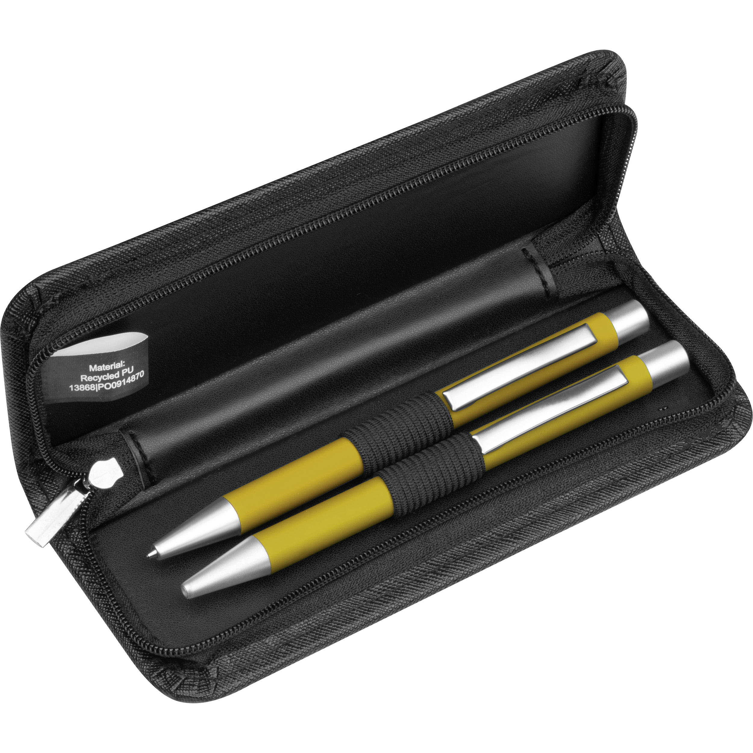 Schreibset bestehend aus einem blauschreibenden Aluminium Kugelschreiber mit einer Kunststoffgroßraummine und einem passenden Aluminium Druckbleistift mit zwei Bleistiftminen (0,5 mm). Beide Stifte verfügen über eine rubber finish Oberfläche die für eine angenehme Hapitk sorgt, das Etui besteht aus recyceltem PU. Ihre Werbung drucken wir auf das Etui. Gravur auf den Stiften auf Anfrage möglich.