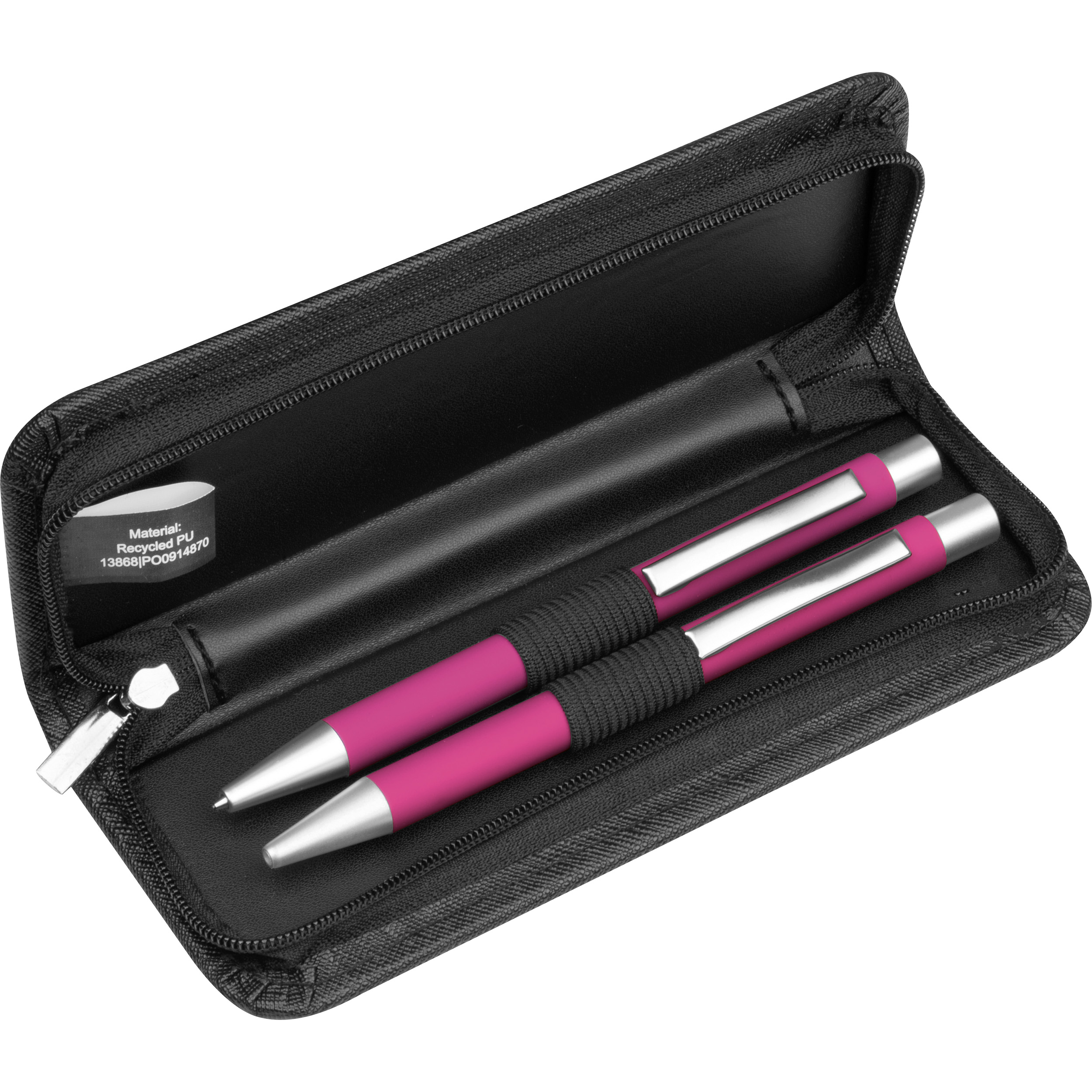 Schreibset bestehend aus einem blauschreibenden Aluminium Kugelschreiber mit einer Kunststoffgroßraummine und einem passenden Aluminium Druckbleistift mit zwei Bleistiftminen (0,5 mm). Beide Stifte verfügen über eine rubber finish Oberfläche die für eine angenehme Hapitk sorgt, das Etui besteht aus recyceltem PU. Ihre Werbung drucken wir auf das Etui. Gravur auf den Stiften auf Anfrage möglich.