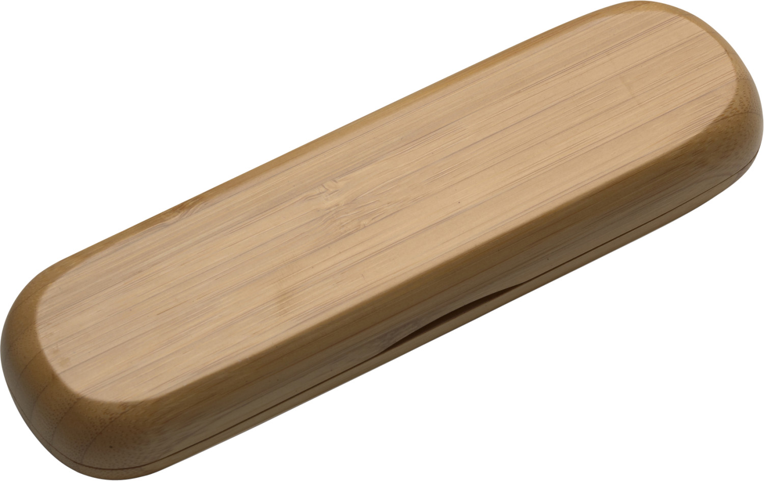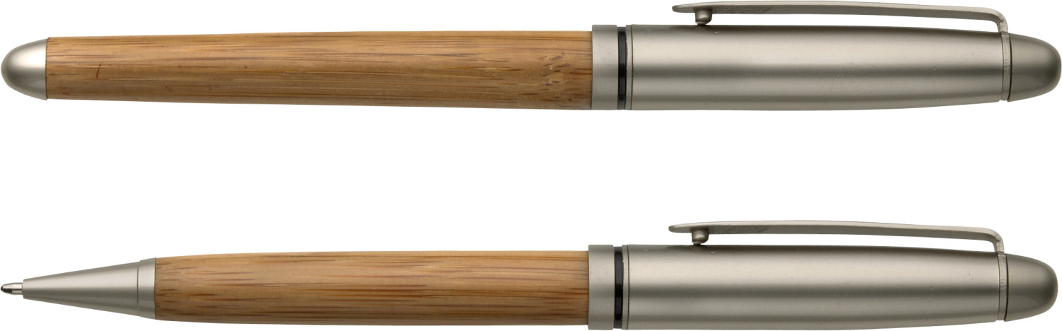 Schreibset aus Bambus bestehend aus Drehkugelschreiber und Rollerball mit Metall-Clip, blauer Mine, verpackt in einer Geschenkbox.