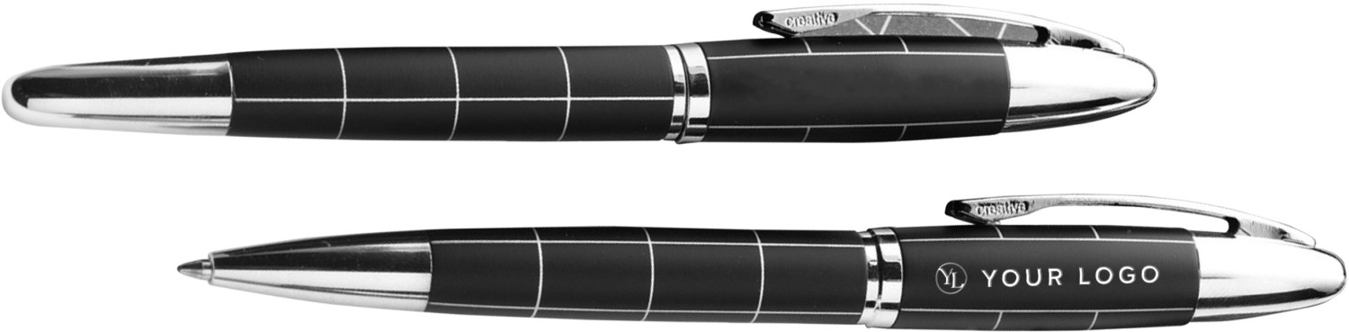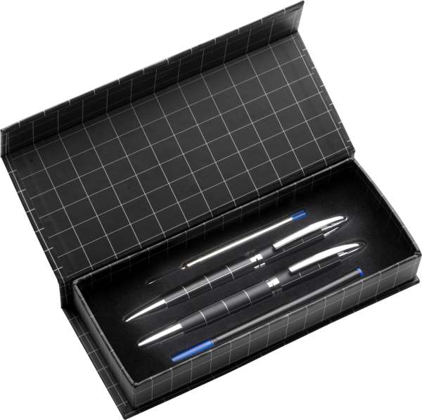Schreibset aus Metall, bestehend aus Rollerball und Kugelschreiber (blaue Mine), mit Drehfunktion, Metall-Clip und Etui mit Magnetverschluss.