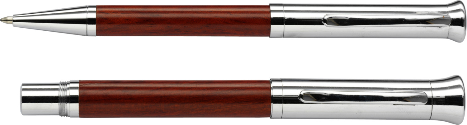 Schreibset aus Rosenholz, bestehend aus Holz-Etui, Drehkugelschreiber und Rollerball mit schwarzer Mine. (Mine wir separat beigelegt).