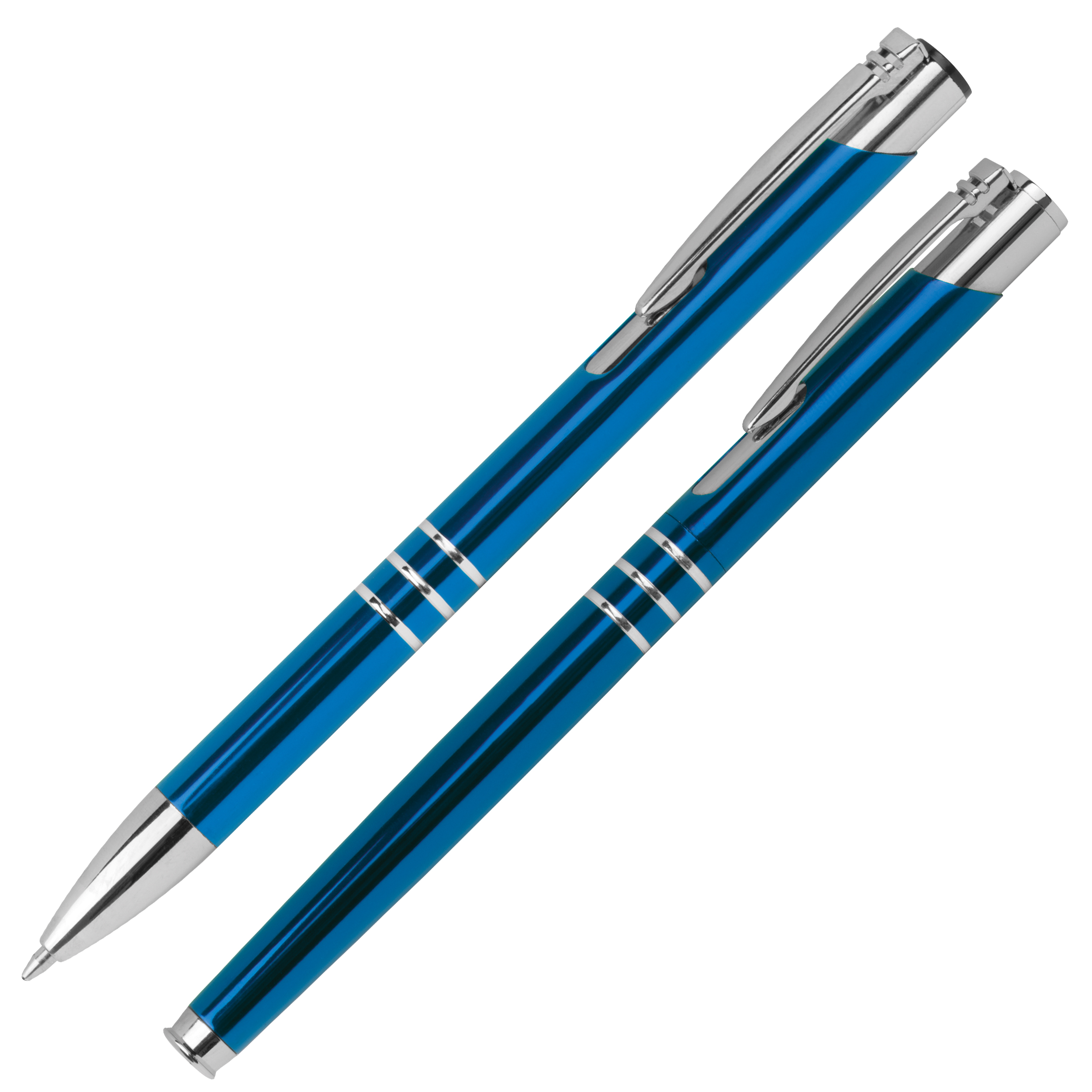 Schreibset aus Metall, bestehend aus einem blau schreibenden Kugelschreiber mit Großraummine und einem Rollerball. Ihre Werbung wird rechts von Clip gelasert und versteht sich für beide Schreibgeräte.