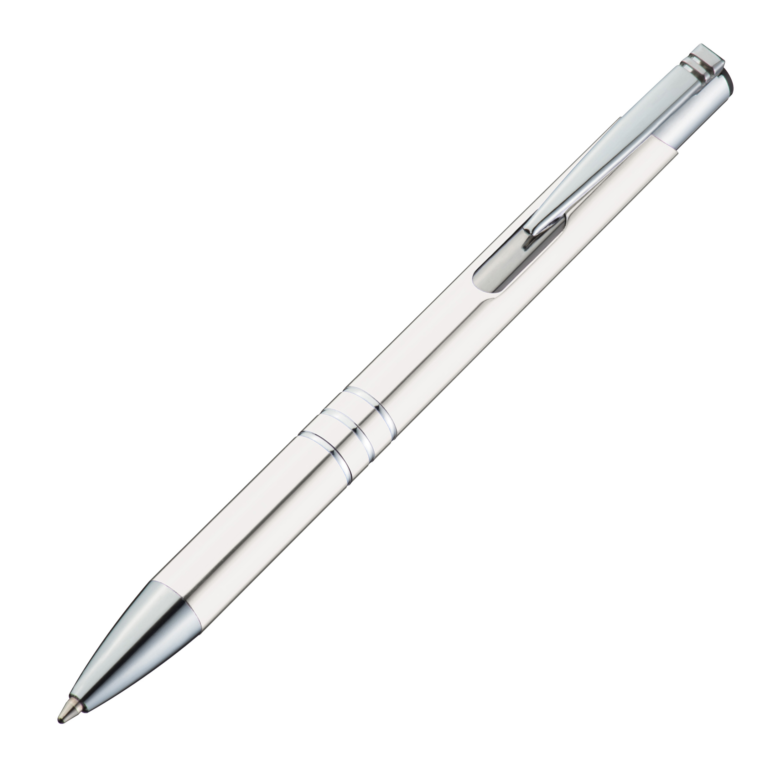 Schreibset aus Metall, bestehend aus einem Kugelschreiber mit blau schreibender Großraummine und einem Druckbleistift mit je 3 Zierringen. Ihre Werbung wird rechts vom Clip gelasert. Der Gravurpreis versteht sich für beide Schreibgeräte.