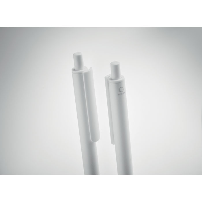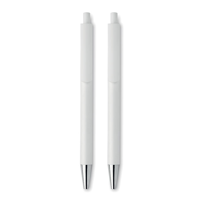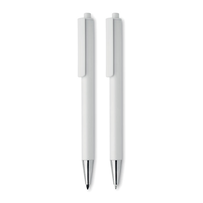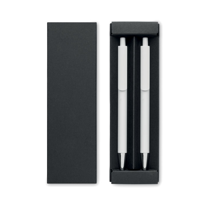 Schreibset aus recyceltem Aluminium. Bestehend aus 2 Kugelschreibern (1x blaue Tinte, 1x Graphitmiene). Präsentiert in einer Schachtel aus recyceltem Papier.