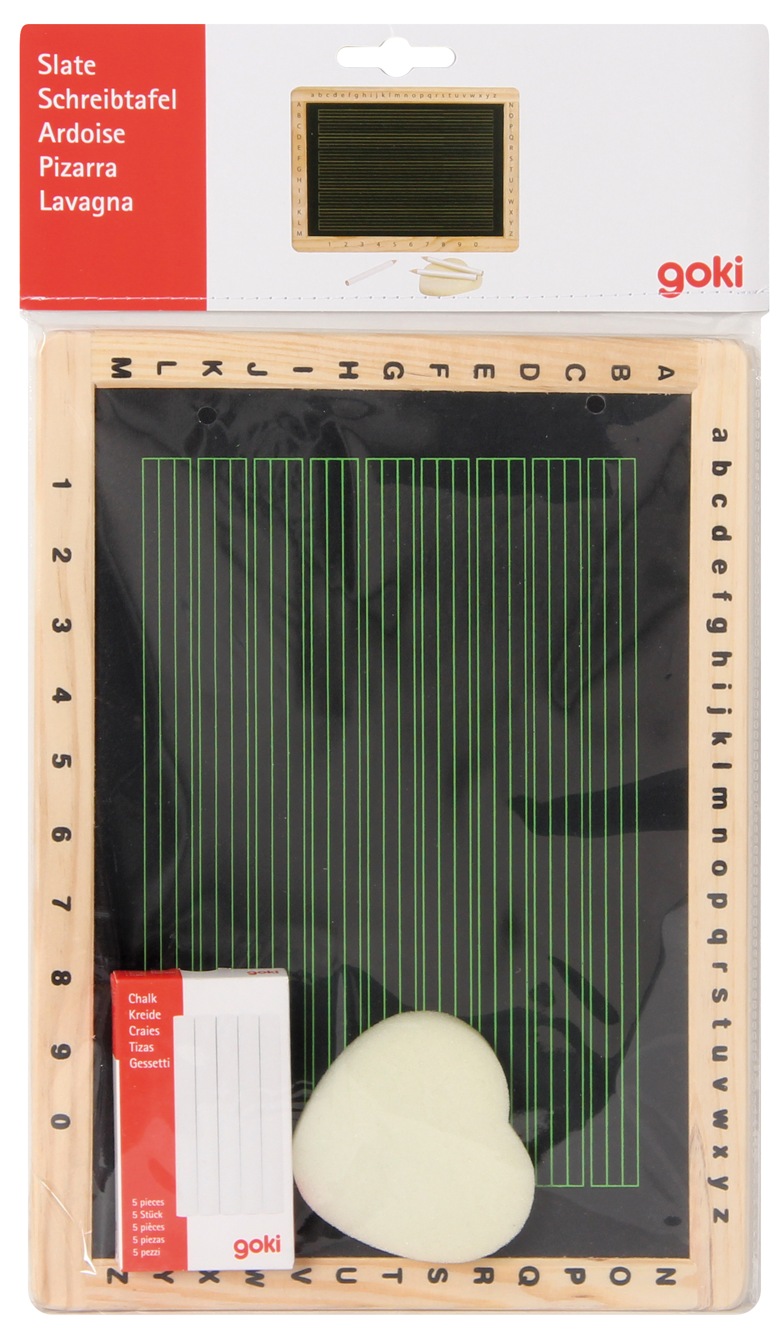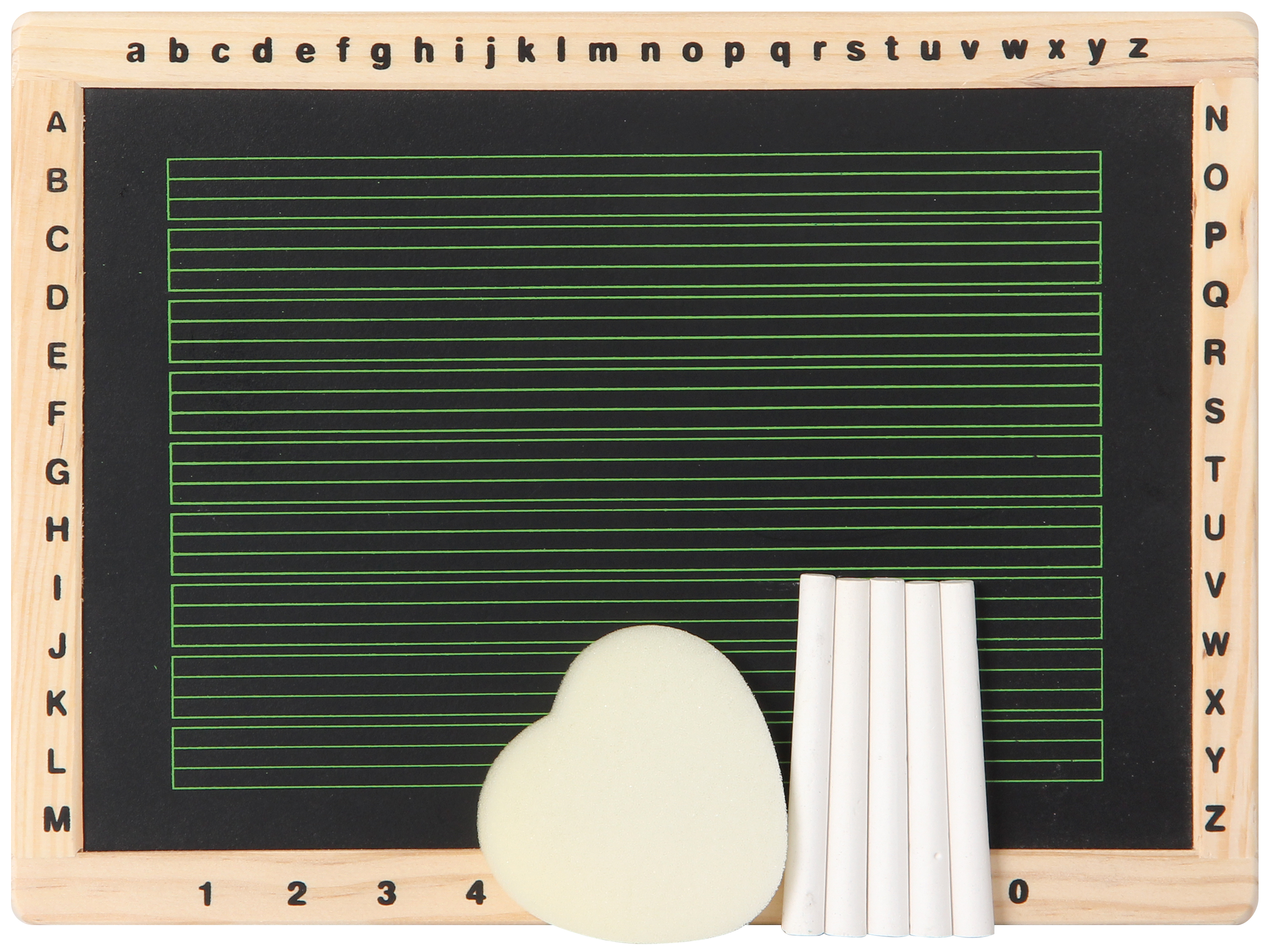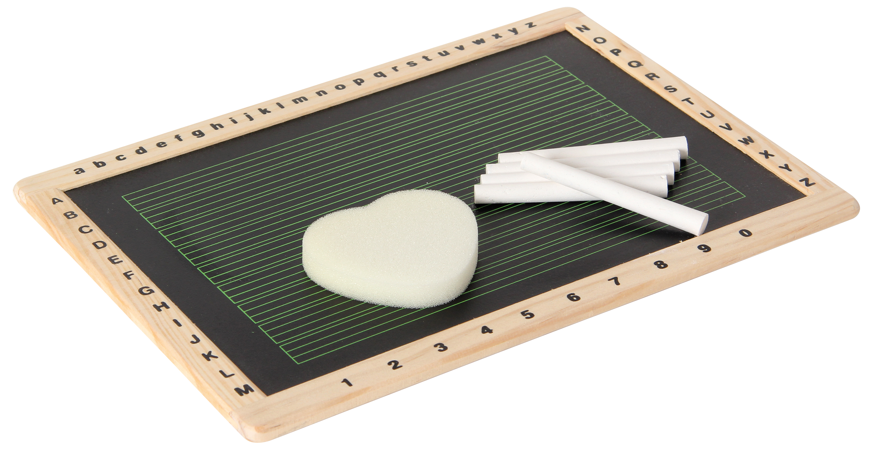 Kreidetafel mit fünf Kreiden und Schwamm im Set.