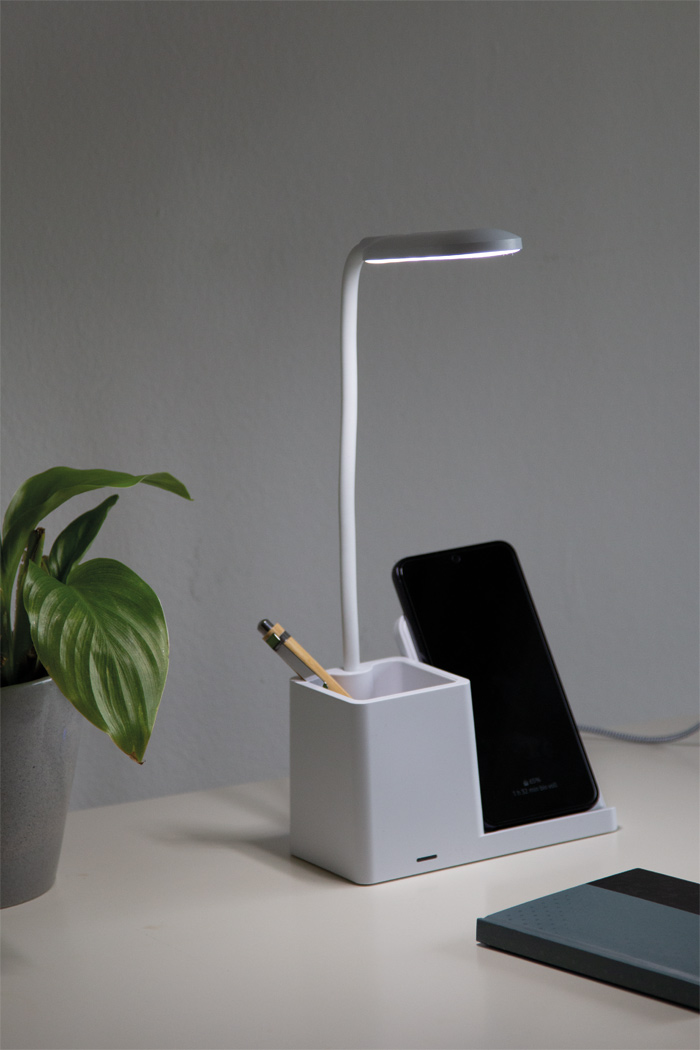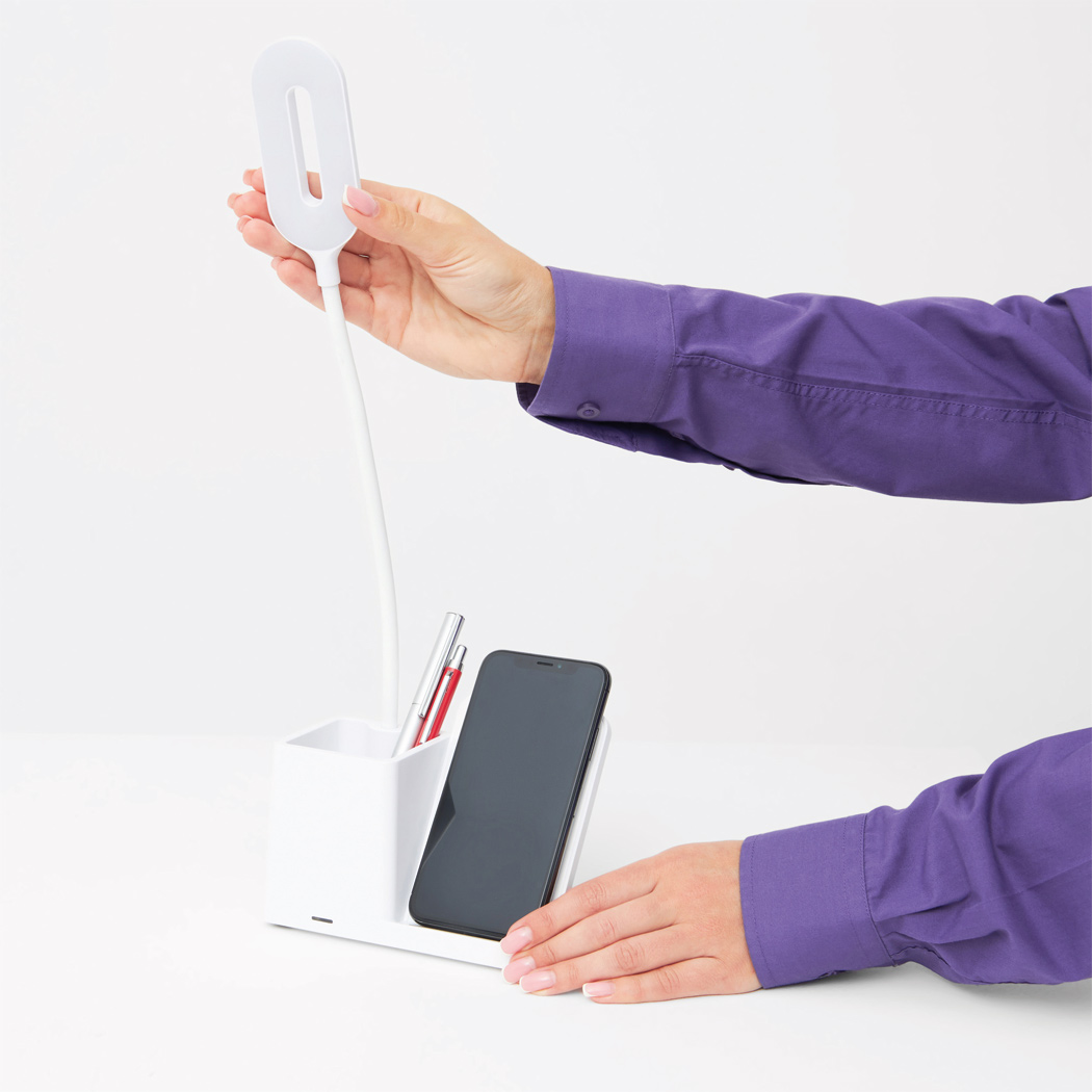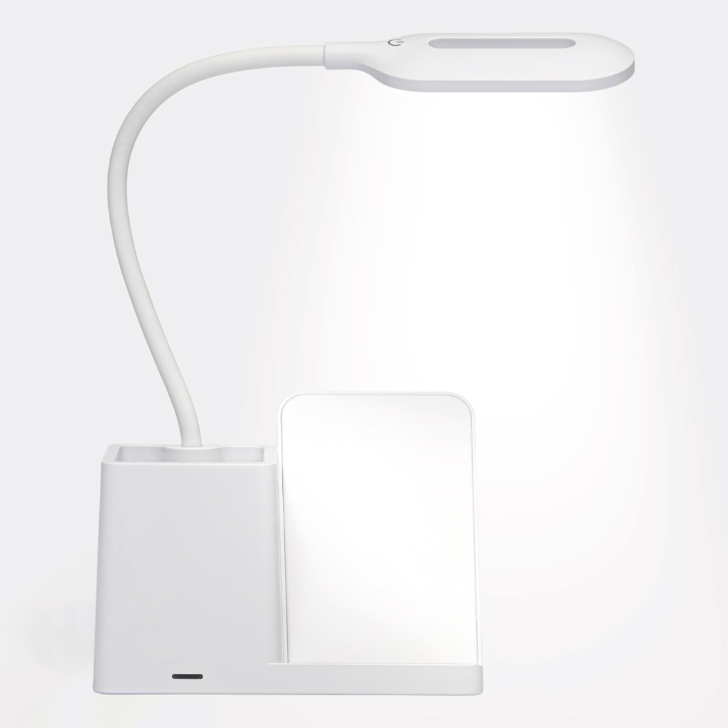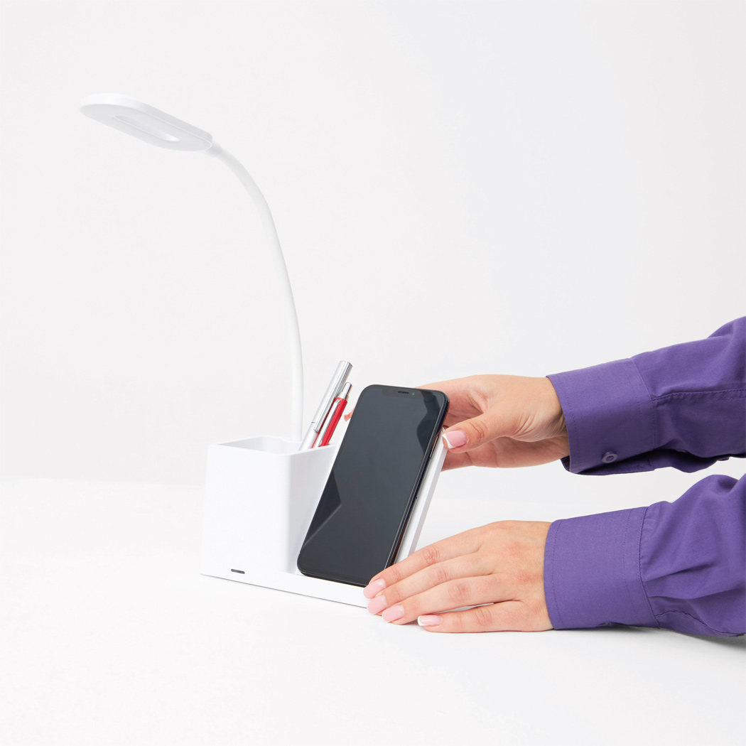 Schreibtischlampe mit Ladestation LIGHT & CHARGE: 360° flexibel schwenkbarer Leuchtarm mit 10 warmweißen und 10 kaltweißen LED, An uns Aus per Fingertipp, Stifthalter und induktive Ladestation, kabelloses Aufladen des Gerätes durch Auflegen auf die Kontaktfläche (Gerät muss für induktives Laden gerüstet sein), inkl. USB-Ladekabel mit USB Typ C Stecker (Länge: ca. 102 cm), Betriebsanzeigelicht, Eingangsleistung: 5V/2A, 9V/2A, Ausgangsleistung: 10W (max.), mit Temperaturkontrolle und Fremdkörpererkennung, 4 rutschhemmende Füße auf der Unterseite, in Box
