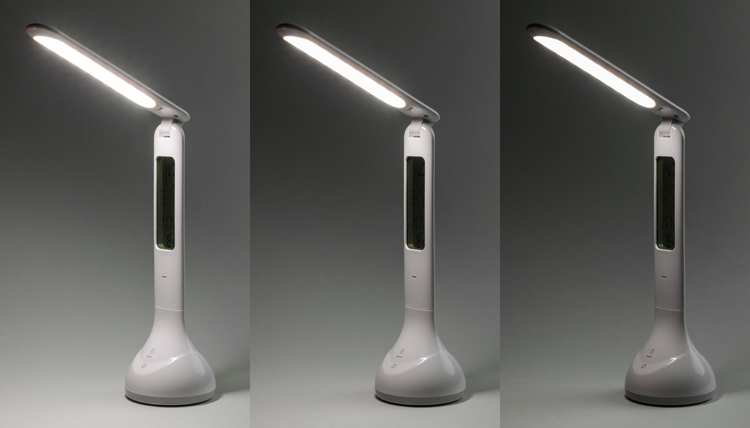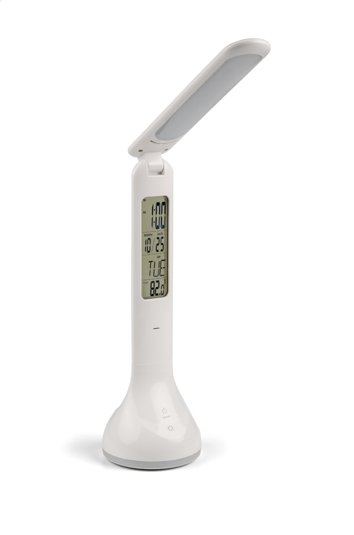 Eine einzigartige Schreibtischlampe mit eingebauter Wetterstation. Die Lampe verfügt über 3 Lichtintensitätsstufen, wodurch der Schreibtisch immer entsprechend beleuchtet ist. Aufgrund des speziellen Filters an den Leuchtdiode ist das Licht natürlicher und hilft, die Augen zu schützen. Die variable mehrfarbige Beleuchtung (RGB - red, green, blue) der Basis verleiht ihr modernes Aussehen und schafft eine unnachahmliche Atmosphäre. Die Lampe ENLI verdankt ihre Funktionalität dem eingebauten Akku mit einem Fassungsvermögen von 1200 mAh. Zudem kann sie an einer beliebigen ohne überflüssige Verkabelung platziert werden. Die eingebaute Wetterstation verfügt über folgende Funktionen: Uhrzeit, Datum, Wochentag, Temperatur, Wecker und Geburtstagserinnerung.