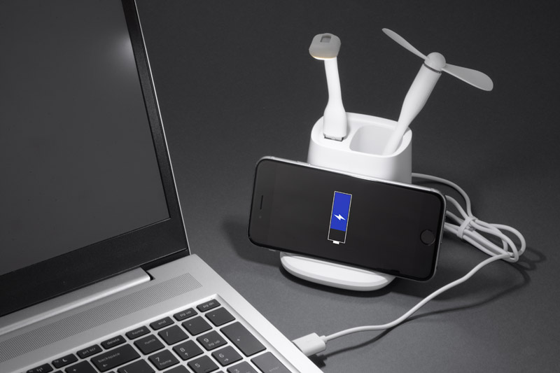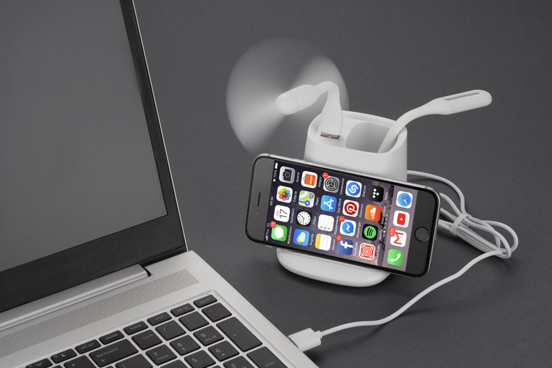 Schreibtischbehälter BERGO ist das perfekte Gadget für Arbeit am Schreibtisch. Es verfügt über ein eingebautes kabelloses Ladegerät, das auch als Telefonständer dient, und zwei USB-Anschlüsse, über die das mitgelieferte Zubehör mit Strom versorgt wird: einen Lüfter und eine Lampe. Wenn Sie kein Zubehör verwenden, können die USB-Anschlüsse als Hubs fungieren. Technische Daten: Micro-USB-Eingang: 5 V / 2A, kabelloser Ladegerätausgang: 5 W, 2 USB-Ausgänge: 5 V / 2A (max.)