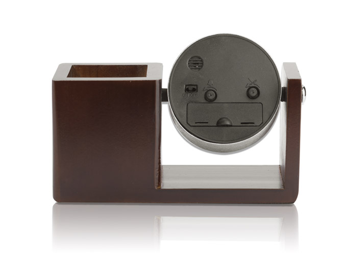 Die Metalluhr mit großem weißem Zifferblatt ist auf einem eleganten Holzständer aus massives holz befestigt. Dieses Set ist mit einem Behälter für Büroartikel ausgestattet. Die Uhr lässt sich nach oben und unten drehen. Diese Uhr ist eine wertvolle Bereicherung für jeden Schreibtisch aufgrund der Kombination aus Ästhetik und Funktionalität. Die Anbringung von Beschriftungen ist auf dem Holzteil für Büroartikel möglich.