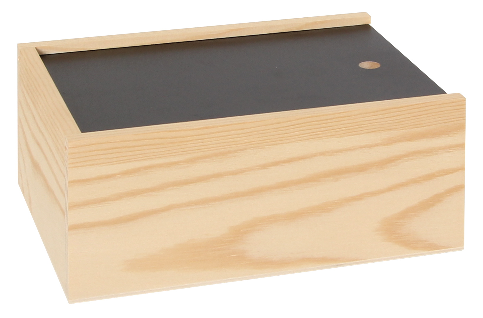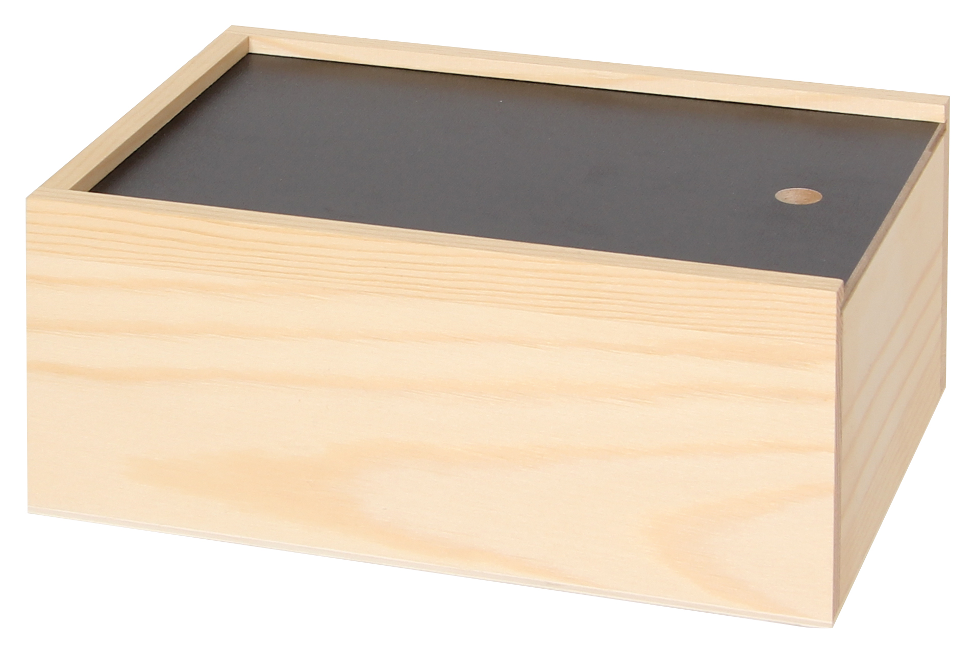 Der Deckel des Schubkistchens ist mit Tafelkreide beschriftbar.