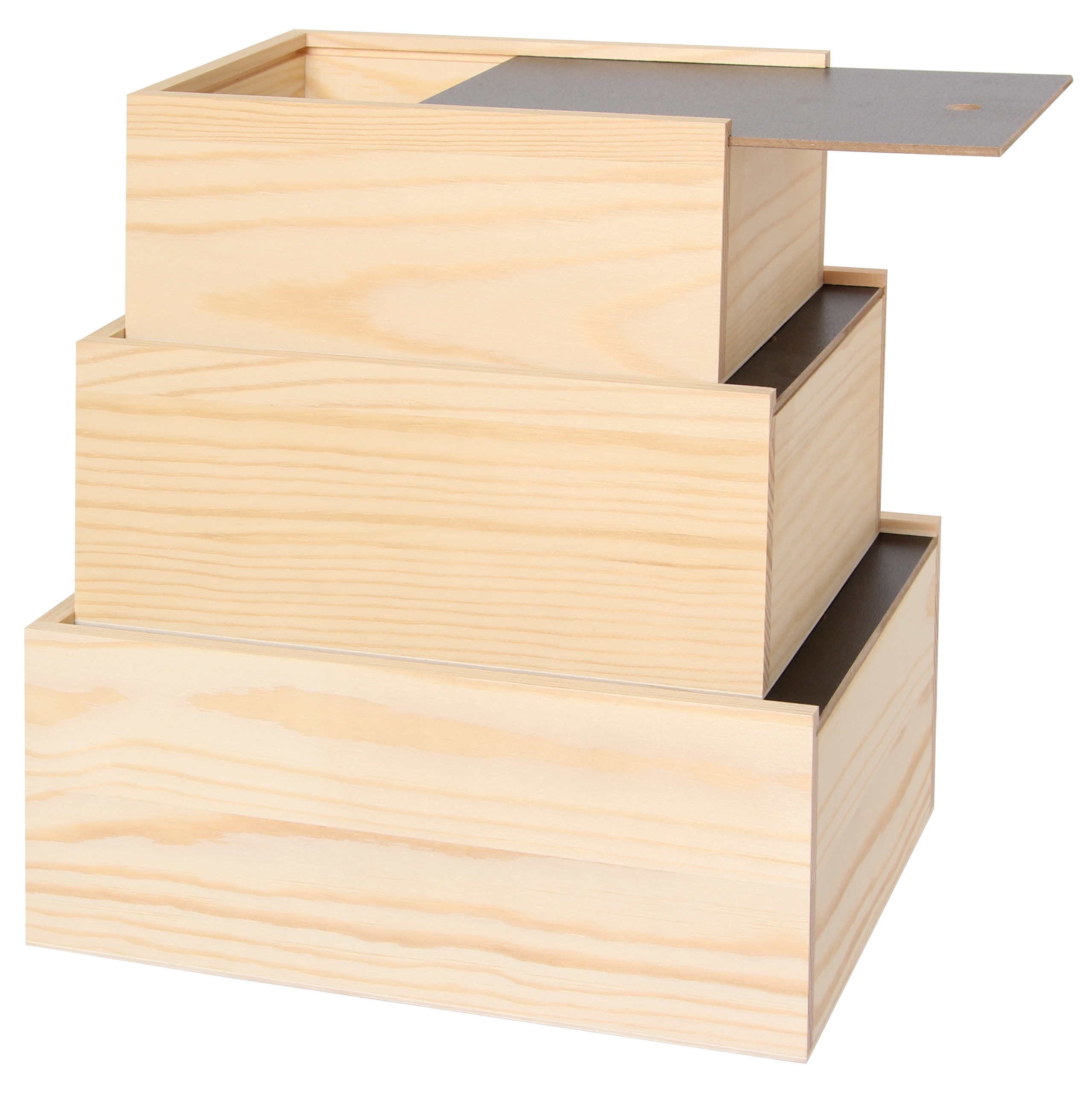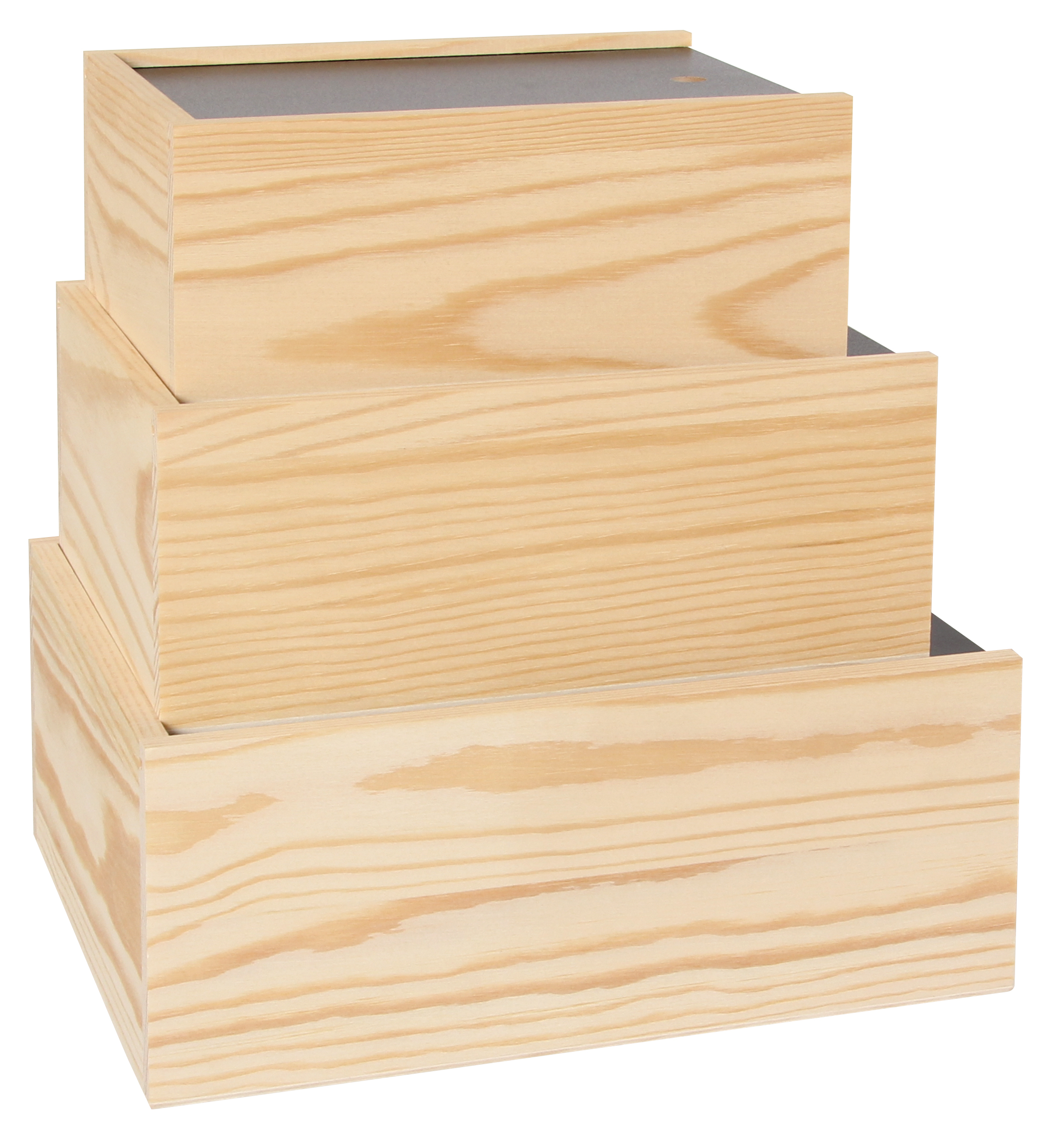 Die Deckel der Schubkistchen sind mit Tafelkreide beschriftbar. Drei verschiedene Größen im Set.