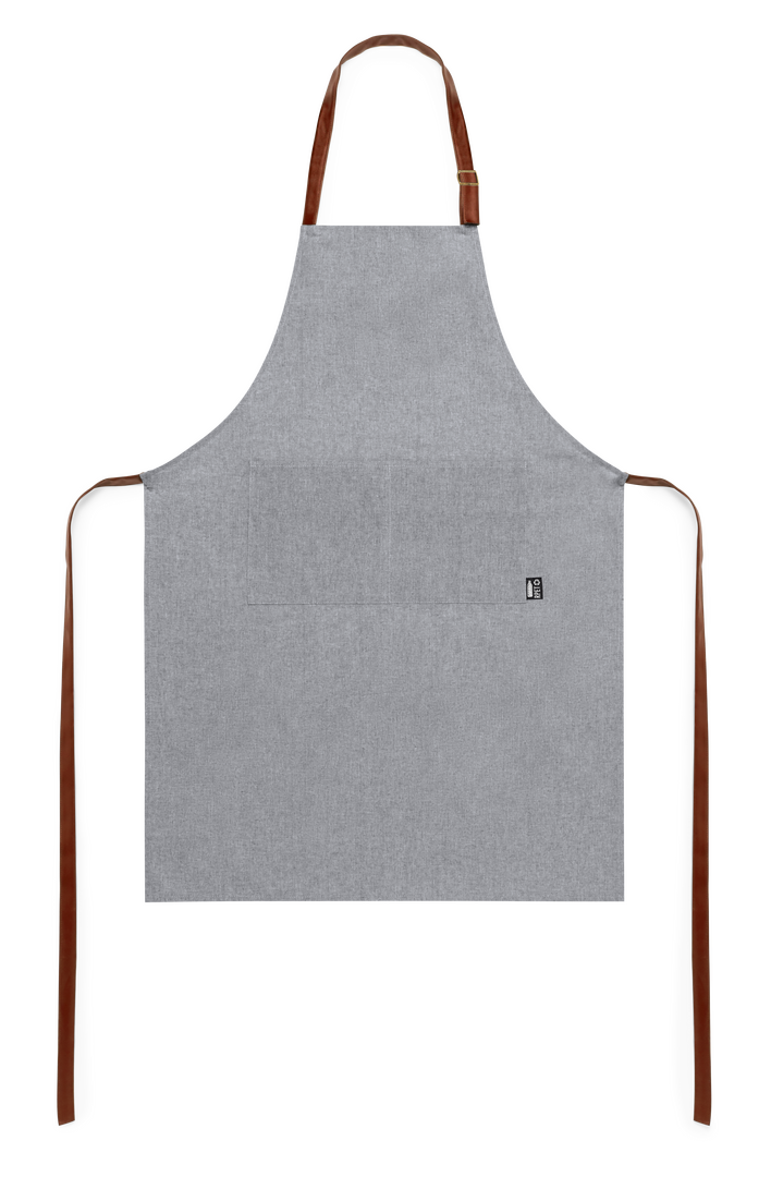 Linie Natur Schürze aus RPET-Material, das aus recyceltem Kunststoff hergestellt wird, um die Wiederverwendung von Kunststoffabfällen zu fördern und die Nachhaltigkeit des Planeten zu unterstützen. Unterhalb des Knies geschnitten, mit Verstellriemen aus widerstandsfähigem Lederimitat und großer Fronttasche. Etikett auf der Tasche mit RPET-Symbol.