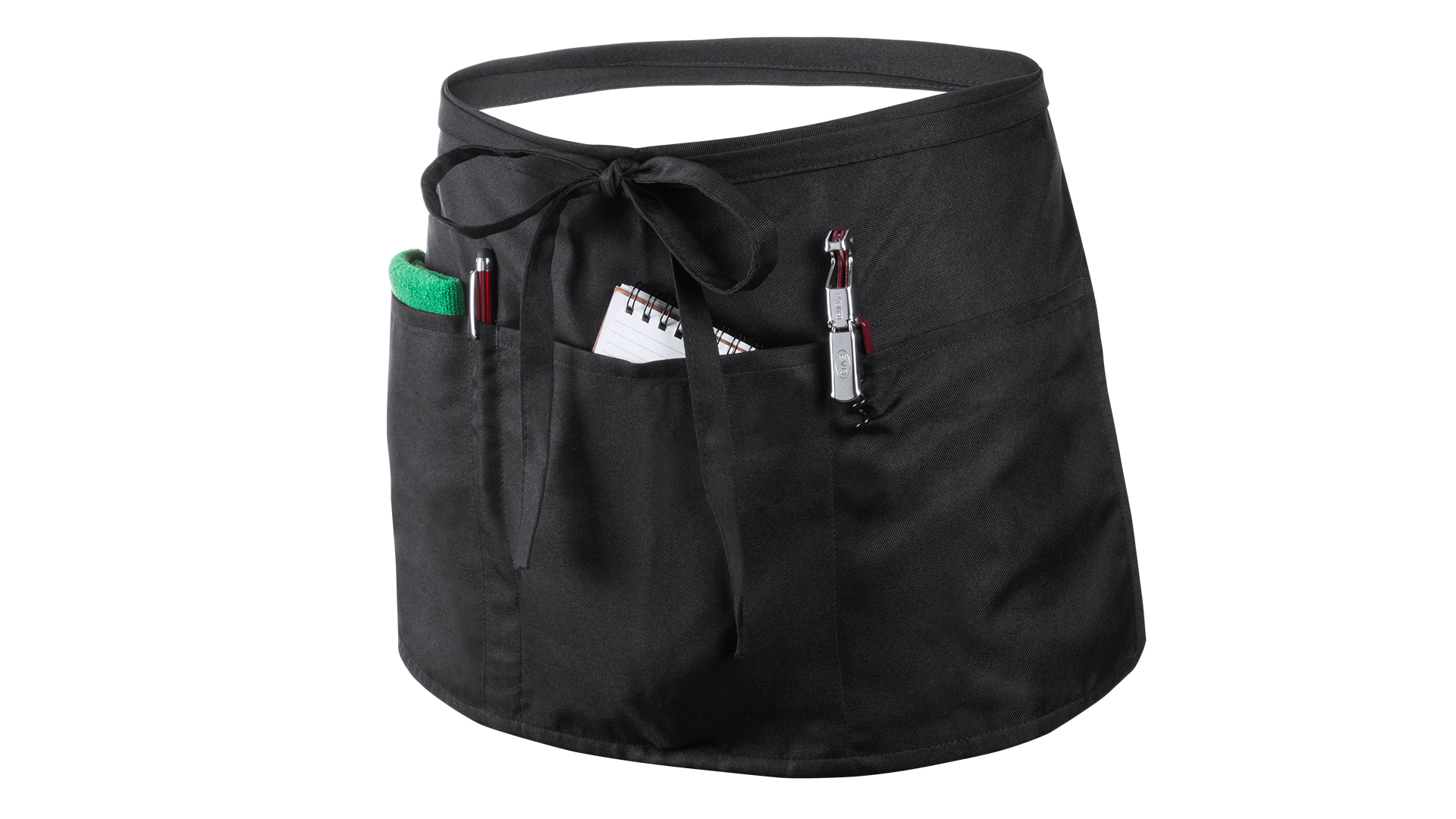 Taillen-Schürze aus 100 % Polyester in geschmeidigem, elegantem Schwarz. Mit 2 großen sowie einer mittelgroßen Tasche und einem Stifthalter. Mit Bändern zum Einstellen.